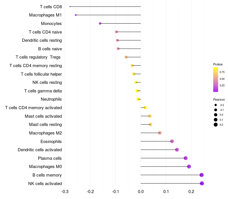 Lollipop of PRPH2 expression and immune infiltrating cell level correlation result in HBV+ samples