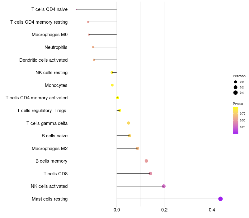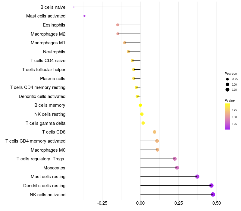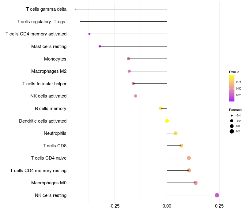 Lollipop of PRRG1 expression and immune infiltrating cell level correlation result in HTLV1+ samples