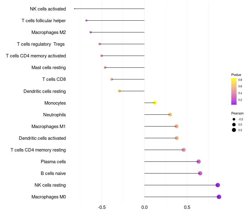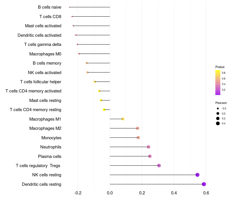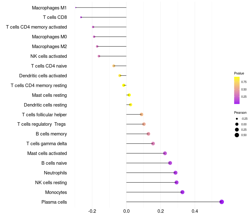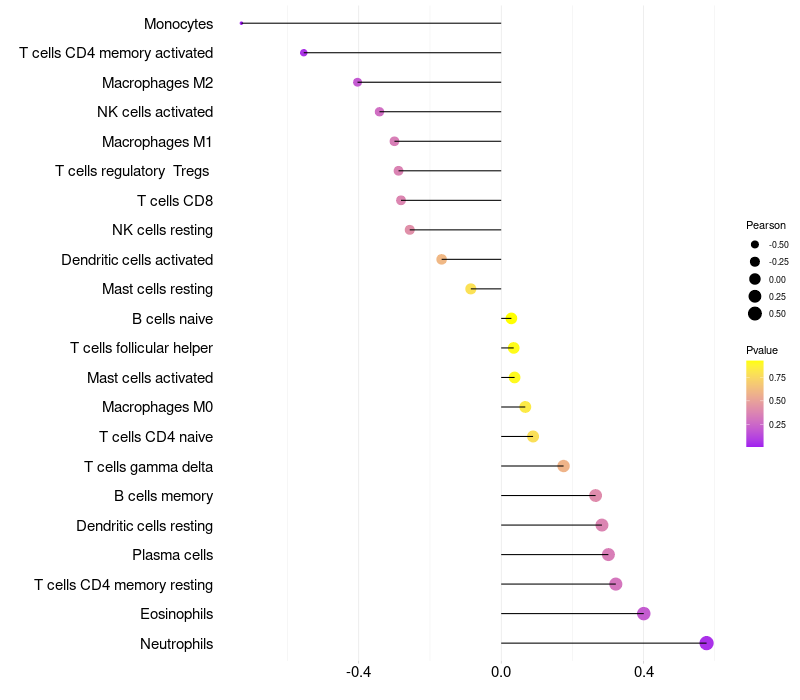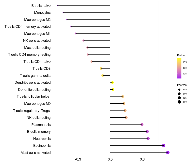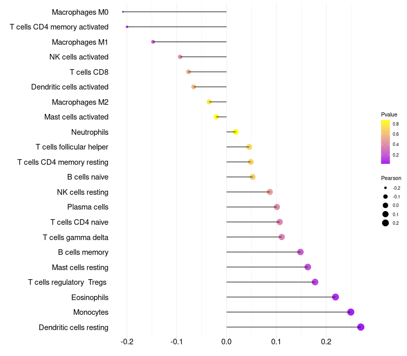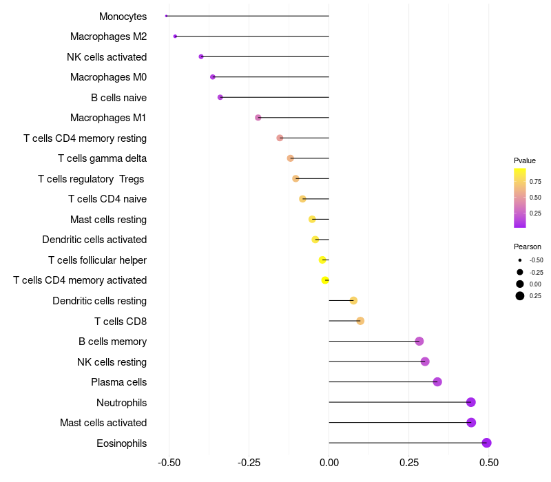 Lollipop of PRSS27 expression and immune infiltrating cell level correlation result in HPV+ samples