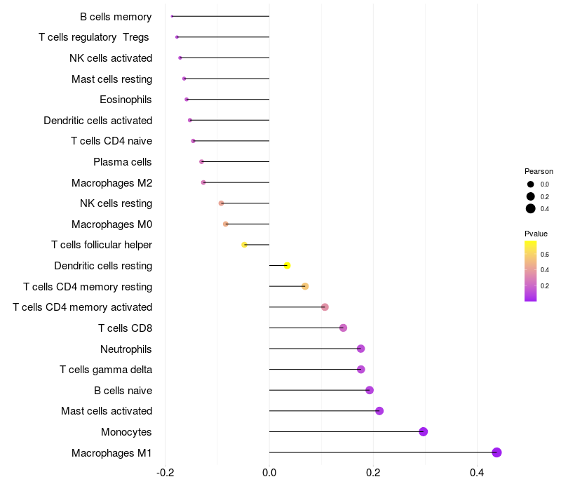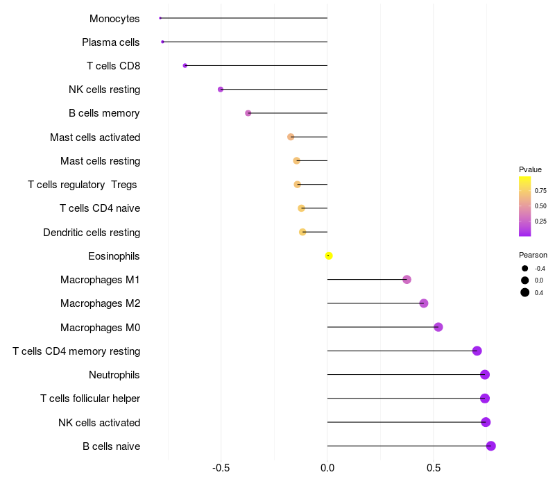 Lollipop of PSAT1 expression and immune infiltrating cell level correlation result in HBV+ Liver cirrhosis samples