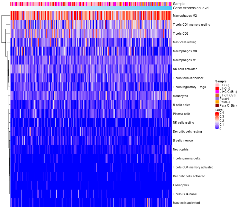 Liver hepatocellular carcinoma HCV (HBV+)(86), Liver hepatocellular carcinoma HCV (HBV-)(19), Liver hepatocellular carcinoma (HBV+)(209), Liver hepatocellular carcinoma (HBV+)(60), Paracancerous HCV (HBV+)(4), Paracancerous (HBV-)(28), Paracancerous (HBV+)(18) |