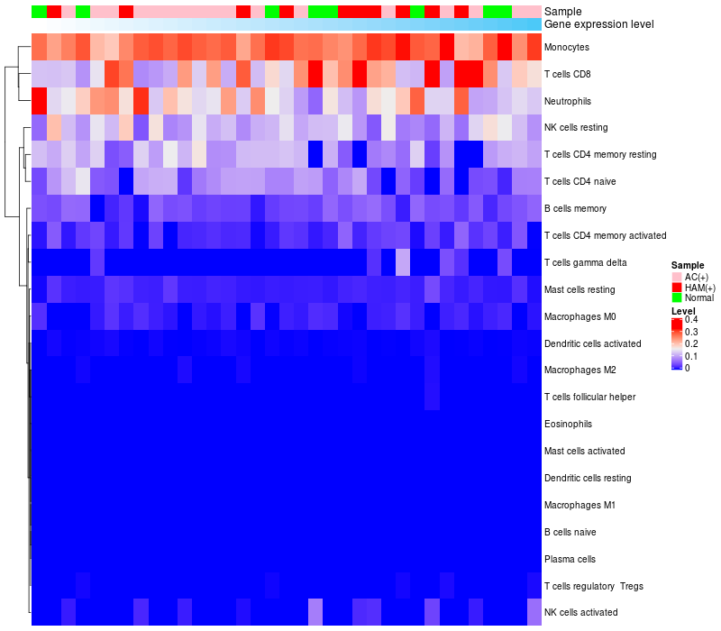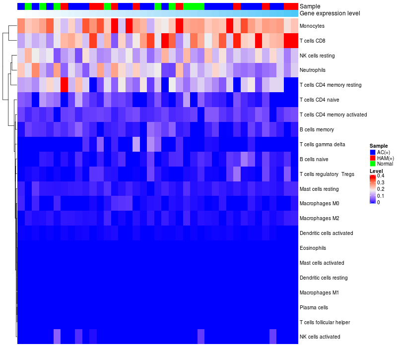 Normal (8), Asymptomatic carriers (HTLV1+)(17), HTLV-1-associated myelopathy (HTLV1+)(10) |