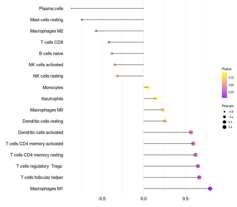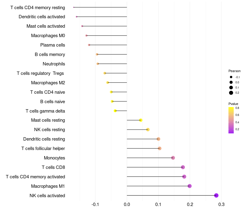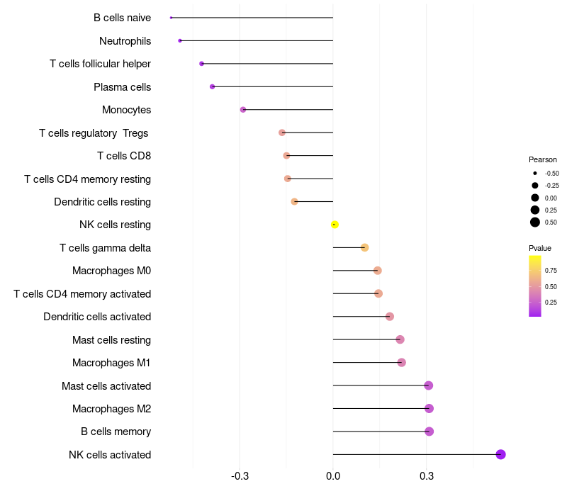 Lollipop of PSG11 expression and immune infiltrating cell level correlation result in HPV+ samples