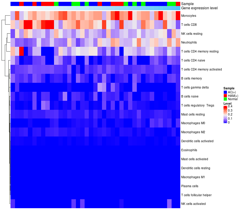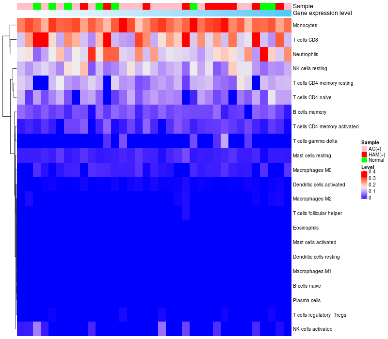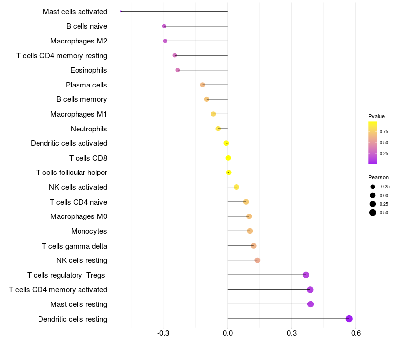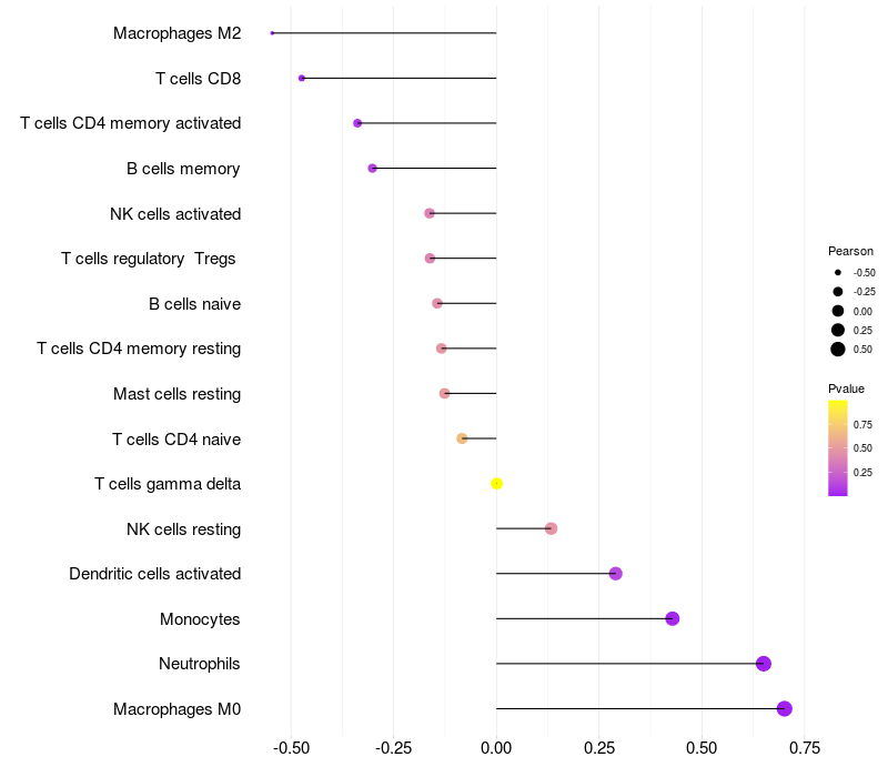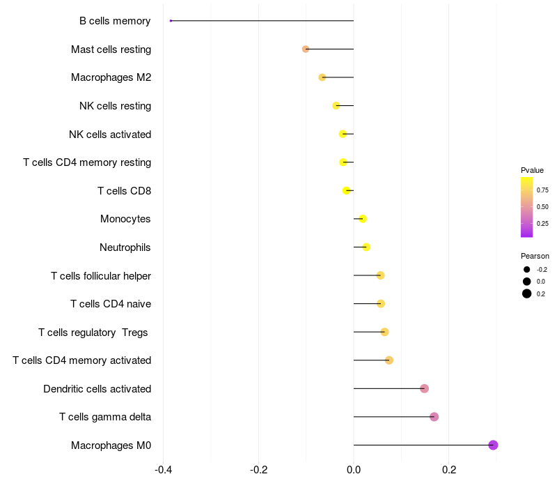 Lollipop of PSG3 expression and immune infiltrating cell level correlation result in HTLV1+ samples
