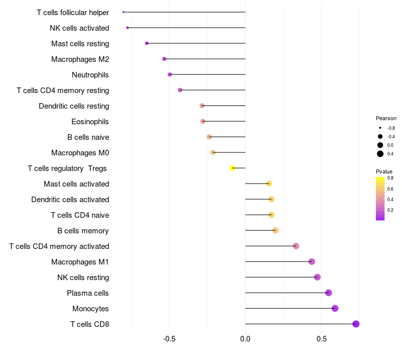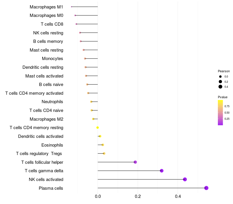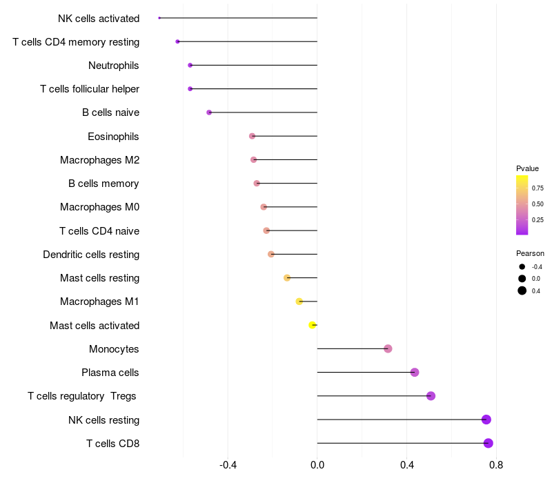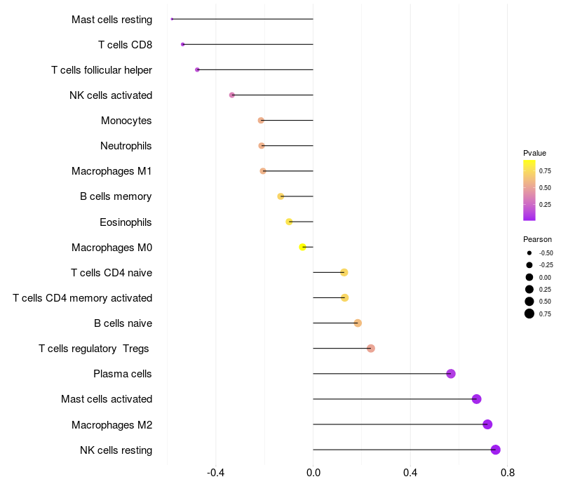 Lollipop of PSG4 expression and immune infiltrating cell level correlation result in HBV+ Liver cirrhosis samples