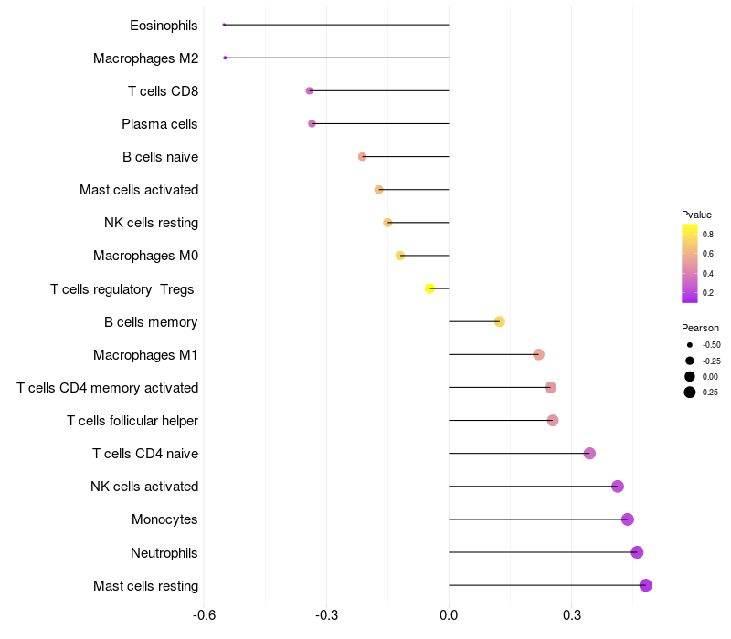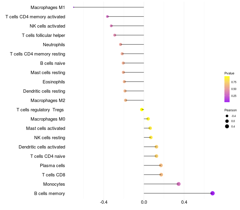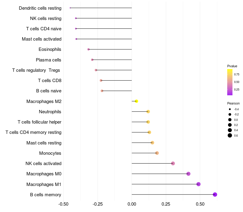 Lollipop of PTEN expression and immune infiltrating cell level correlation result in HBV+ Hepatocellular carcinoma samples