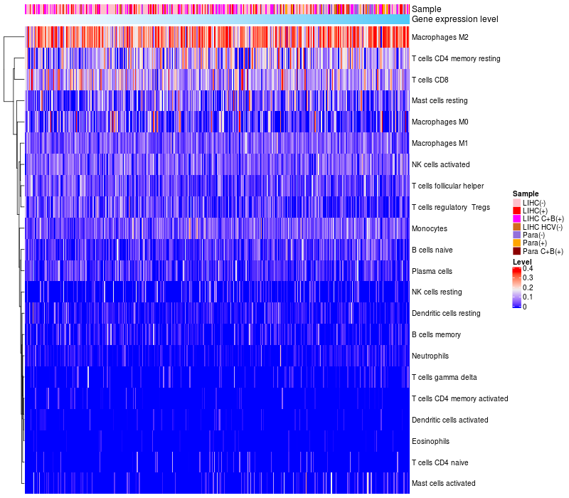 Liver hepatocellular carcinoma HCV (HBV+)(86), Liver hepatocellular carcinoma HCV (HBV-)(19), Liver hepatocellular carcinoma (HBV+)(209), Liver hepatocellular carcinoma (HBV+)(60), Paracancerous HCV (HBV+)(4), Paracancerous (HBV-)(28), Paracancerous (HBV+)(18) |