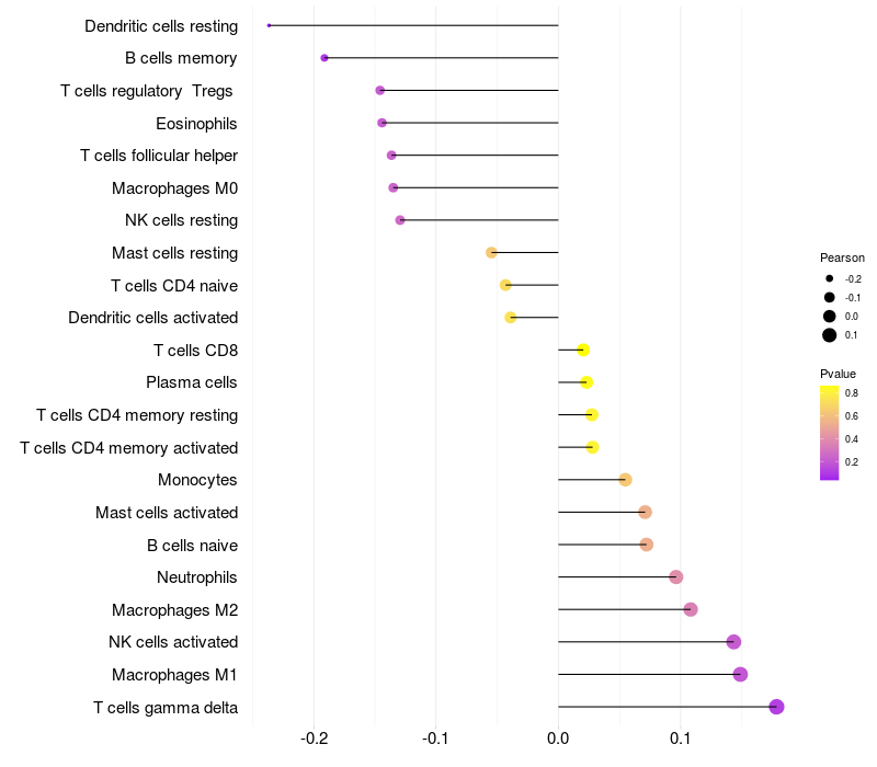 Lollipop of PTEN expression and immune infiltrating cell level correlation result in HBV+ samples