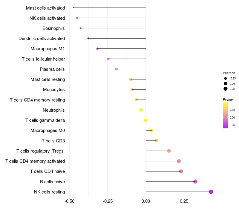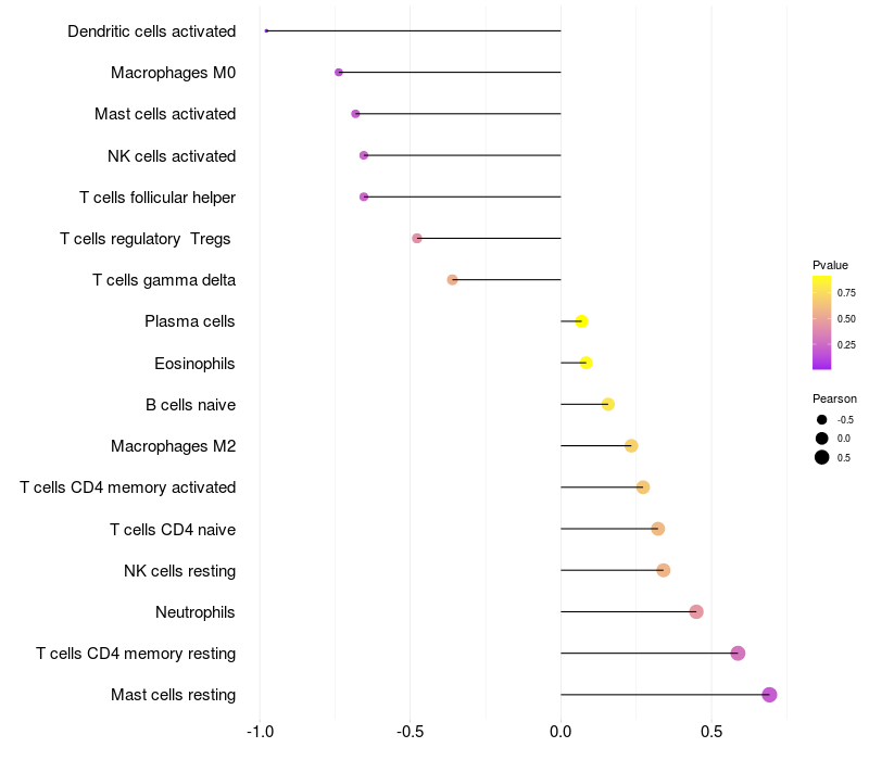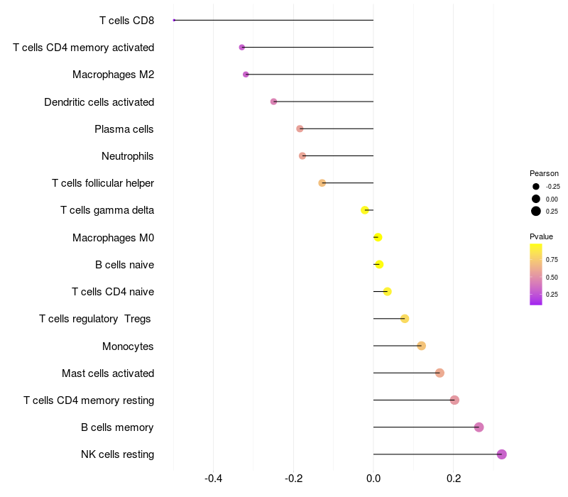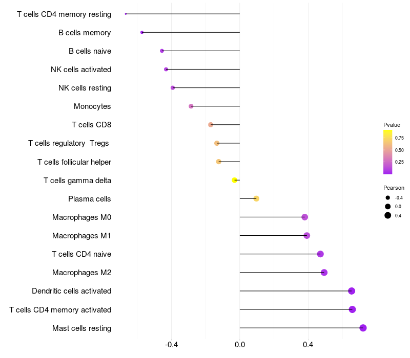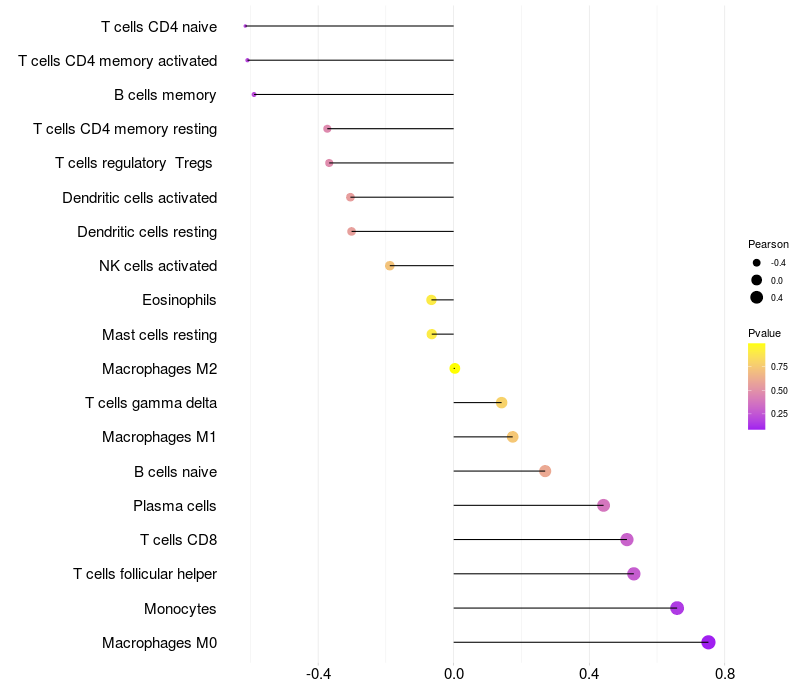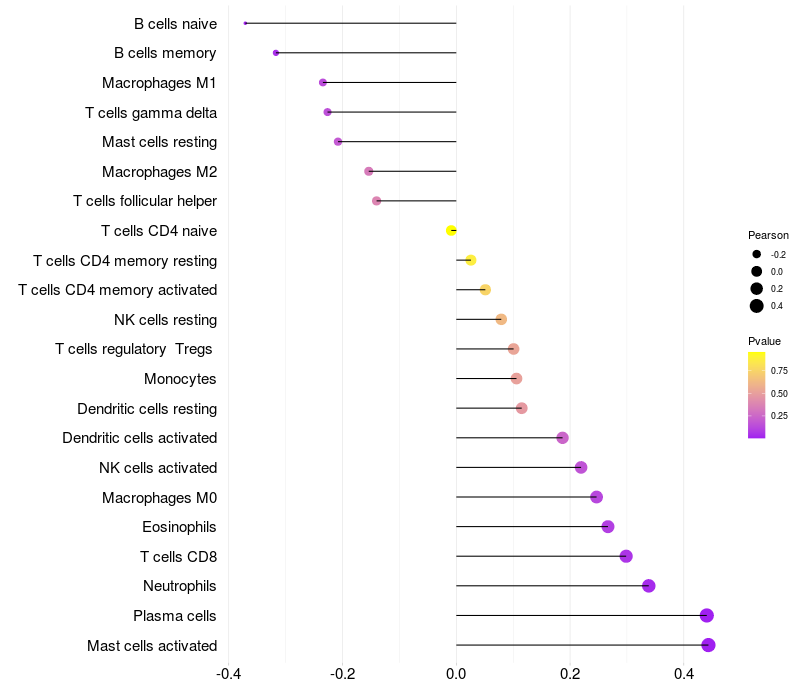 Lollipop of PTGFRN expression and immune infiltrating cell level correlation result in EBV+ samples