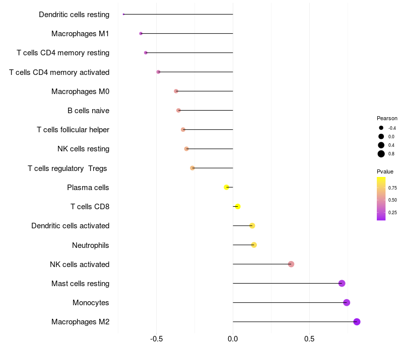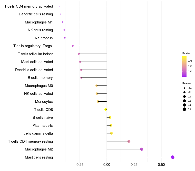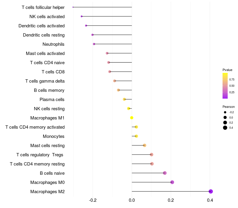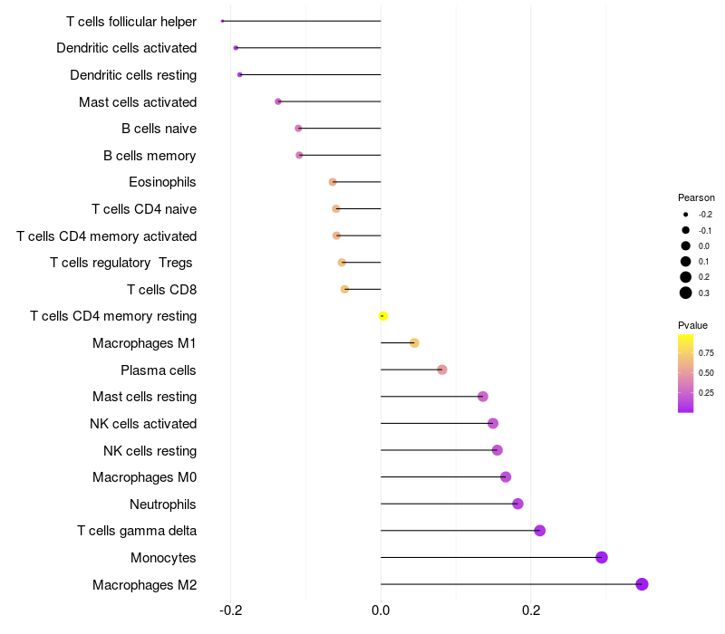Lollipop of PTGIS expression and immune infiltrating cell level correlation result in HPV+ samples