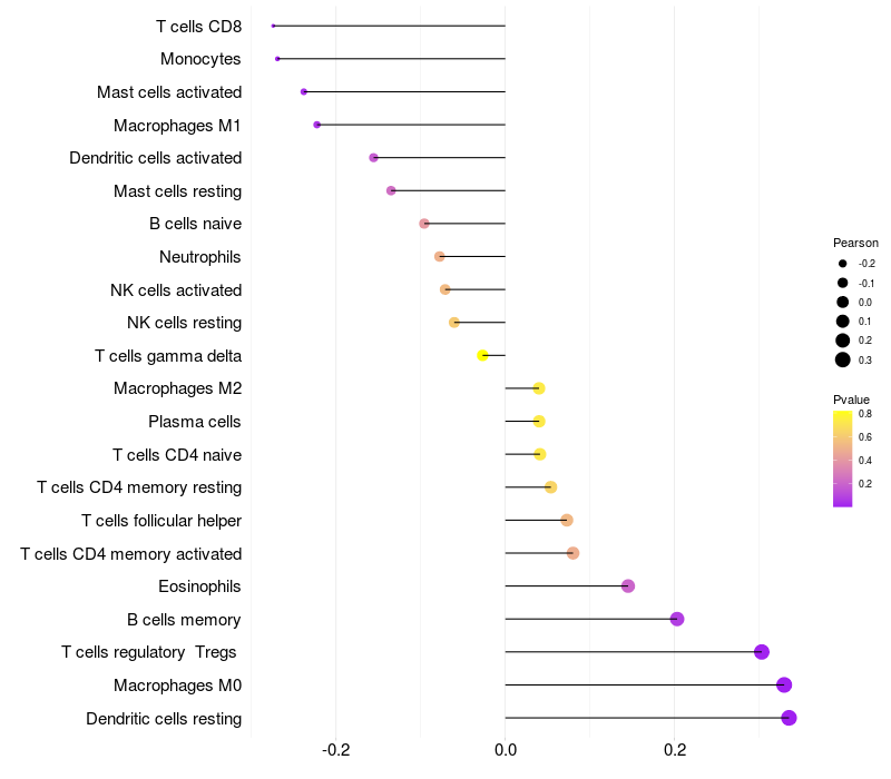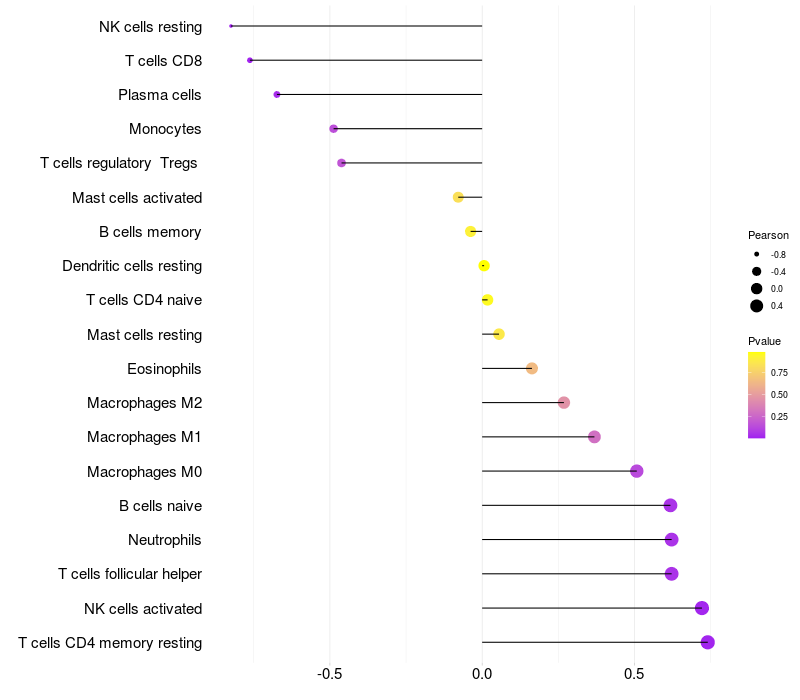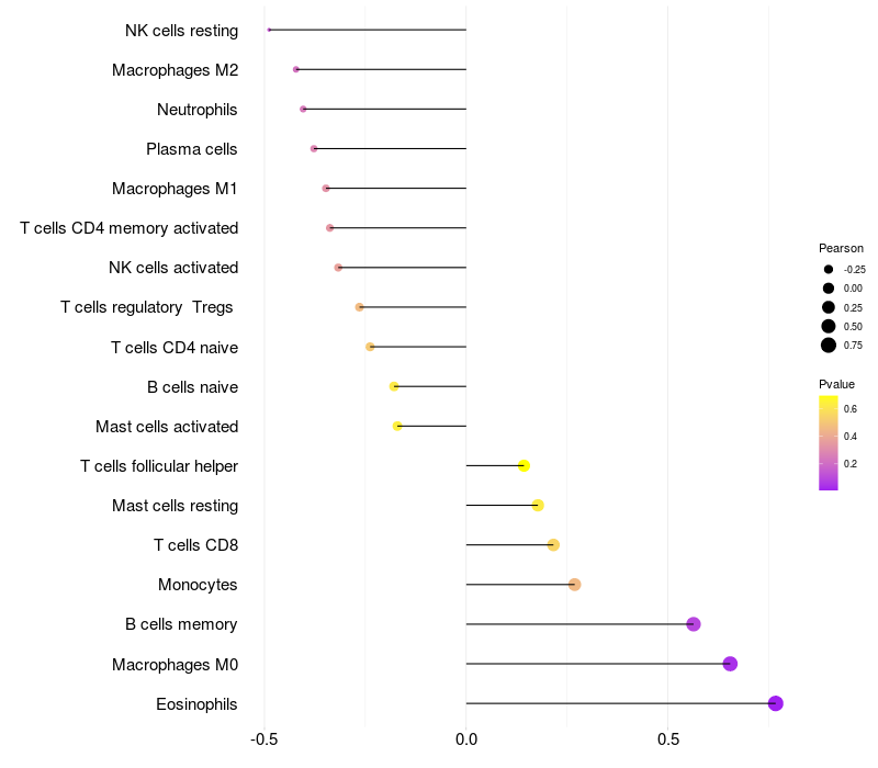 Lollipop of PTK2 expression and immune infiltrating cell level correlation result in HBV+ Hepatocellular carcinoma samples