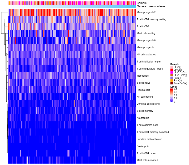 Liver hepatocellular carcinoma HCV (HBV+)(86), Liver hepatocellular carcinoma HCV (HBV-)(19), Liver hepatocellular carcinoma (HBV+)(209), Liver hepatocellular carcinoma (HBV+)(60), Paracancerous HCV (HBV+)(4), Paracancerous (HBV-)(28), Paracancerous (HBV+)(18) |