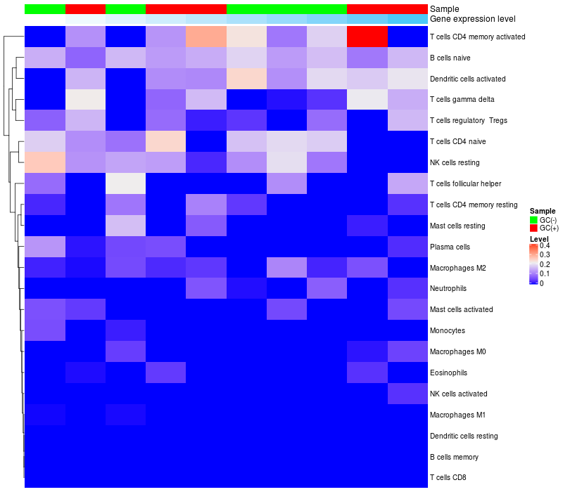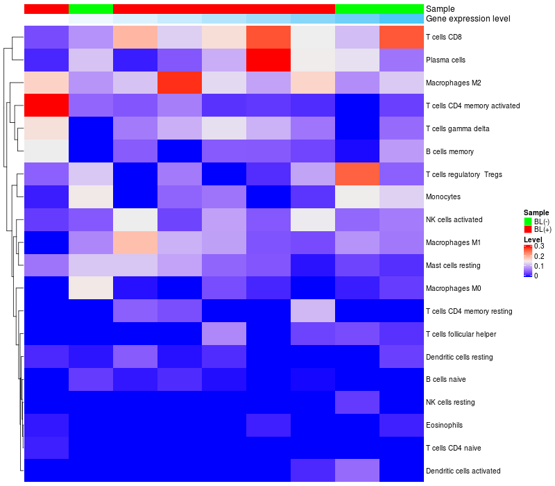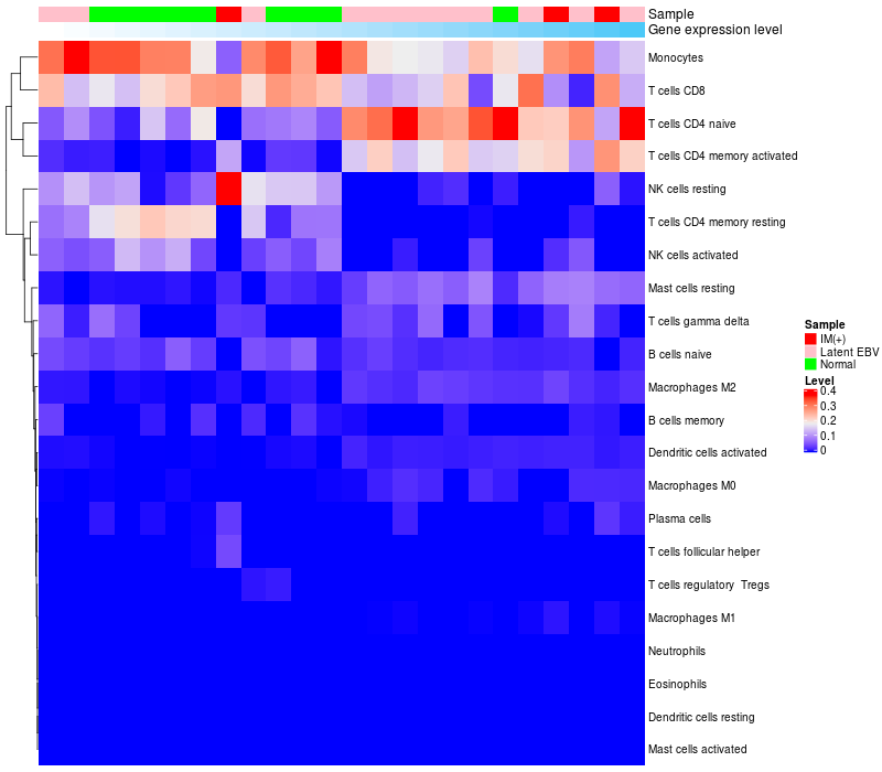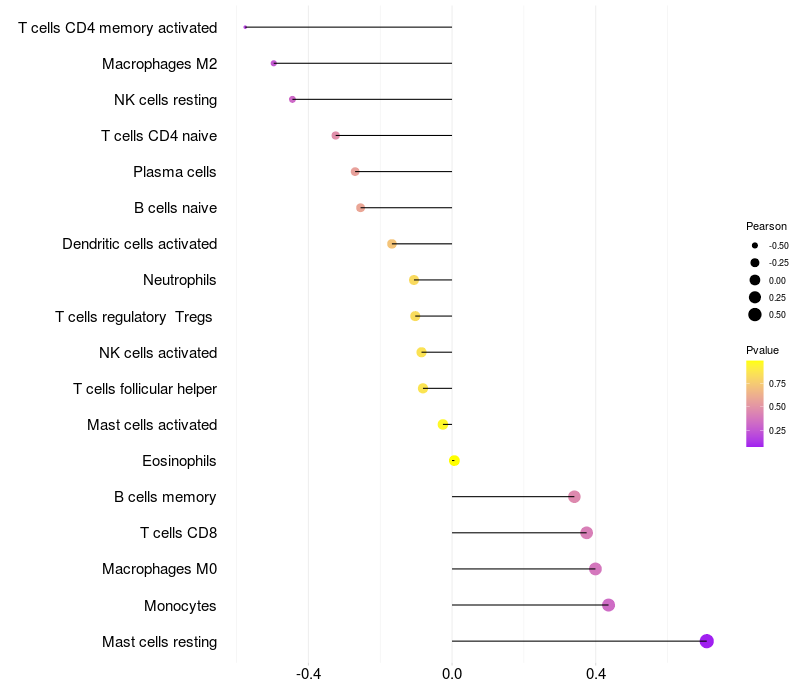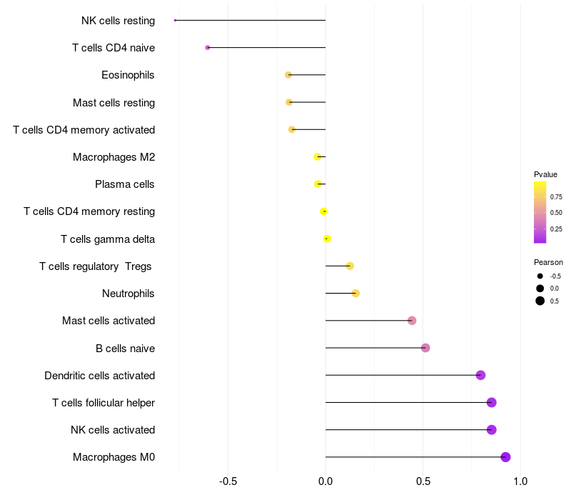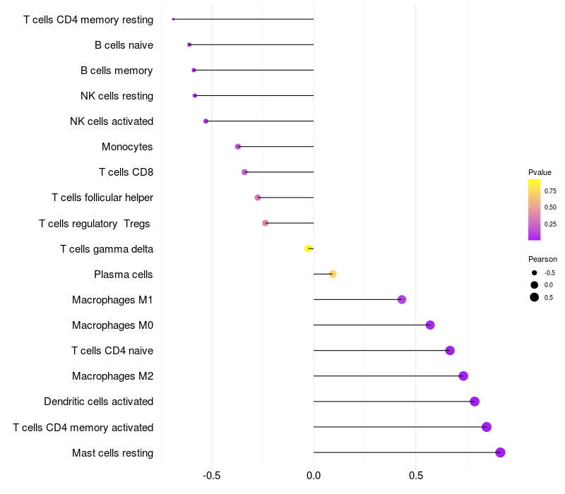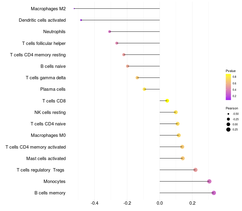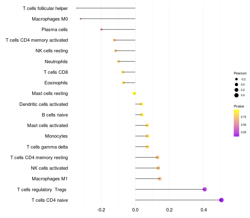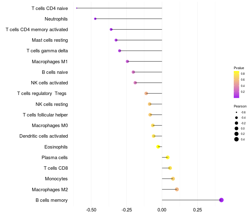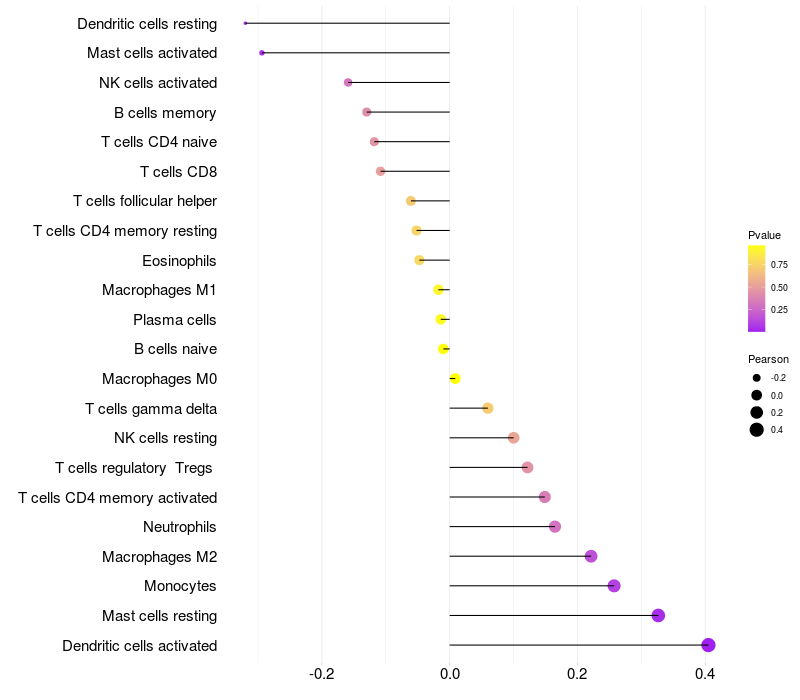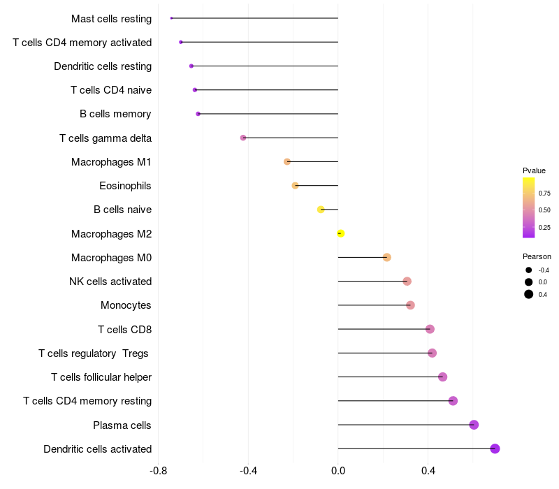 Lollipop of PTPDC1 expression and immune infiltrating cell level correlation result in EBV+ samples