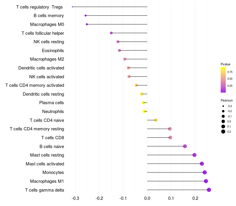 Lollipop of PTPRD expression and immune infiltrating cell level correlation result in HBV+ samples