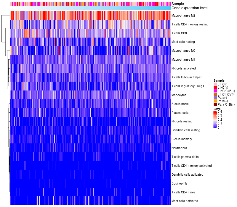 Liver hepatocellular carcinoma HCV (HBV+)(86), Liver hepatocellular carcinoma HCV (HBV-)(19), Liver hepatocellular carcinoma (HBV+)(209), Liver hepatocellular carcinoma (HBV+)(60), Paracancerous HCV (HBV+)(4), Paracancerous (HBV-)(28), Paracancerous (HBV+)(18) |