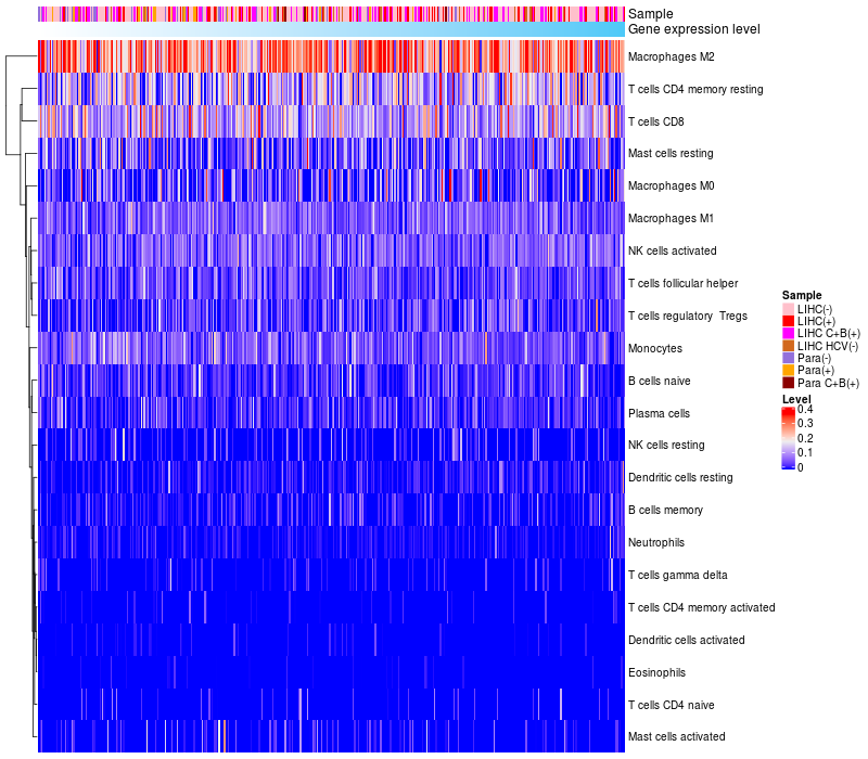 Liver hepatocellular carcinoma HCV (HBV+)(86), Liver hepatocellular carcinoma HCV (HBV-)(19), Liver hepatocellular carcinoma (HBV+)(209), Liver hepatocellular carcinoma (HBV+)(60), Paracancerous HCV (HBV+)(4), Paracancerous (HBV-)(28), Paracancerous (HBV+)(18) |