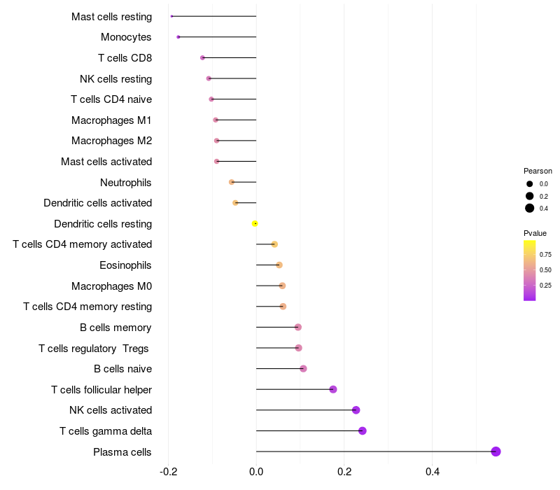 Lollipop of PTPRZ1 expression and immune infiltrating cell level correlation result in HBV+ samples