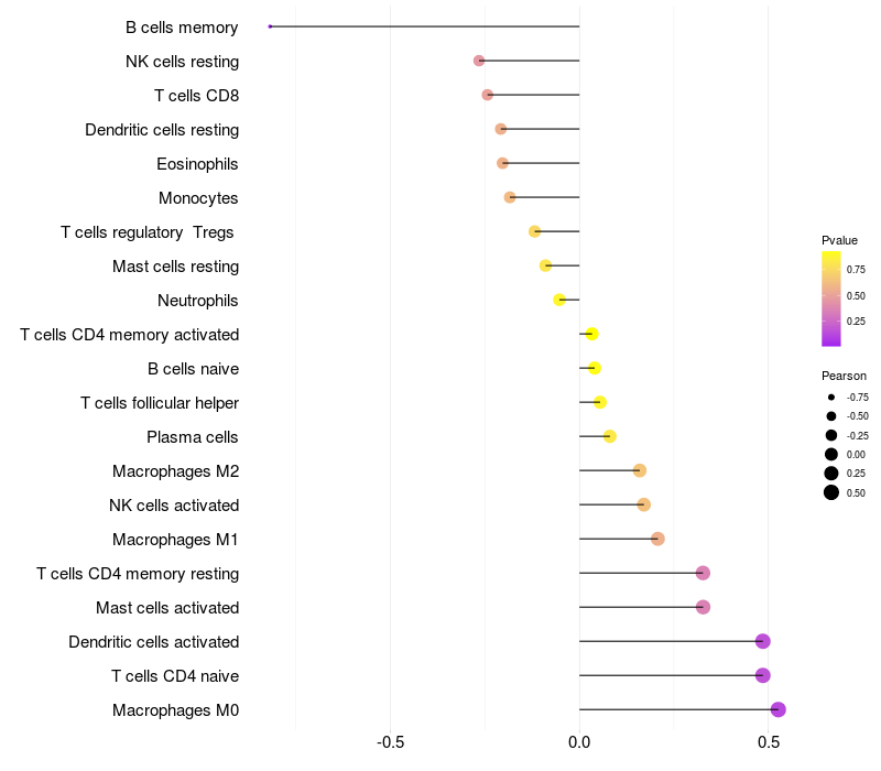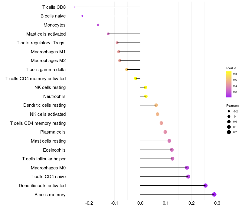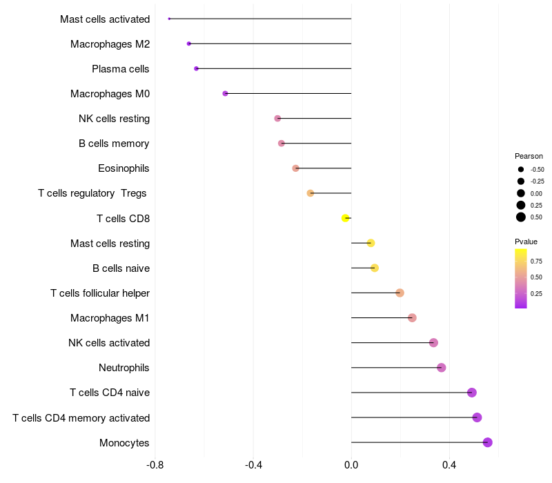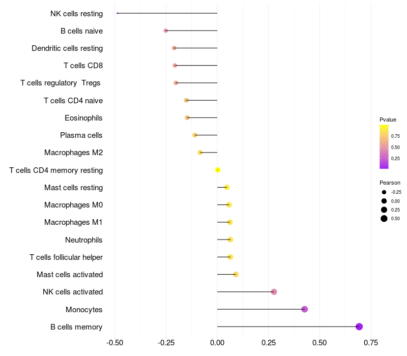 Lollipop of PURB expression and immune infiltrating cell level correlation result in HBV+ Liver cirrhosis samples