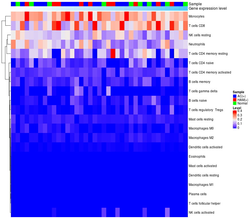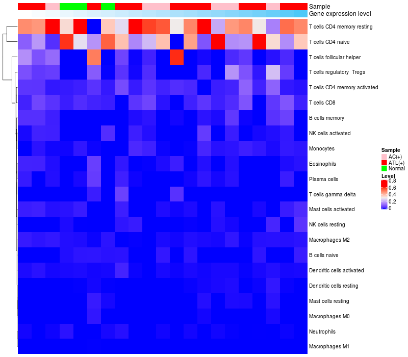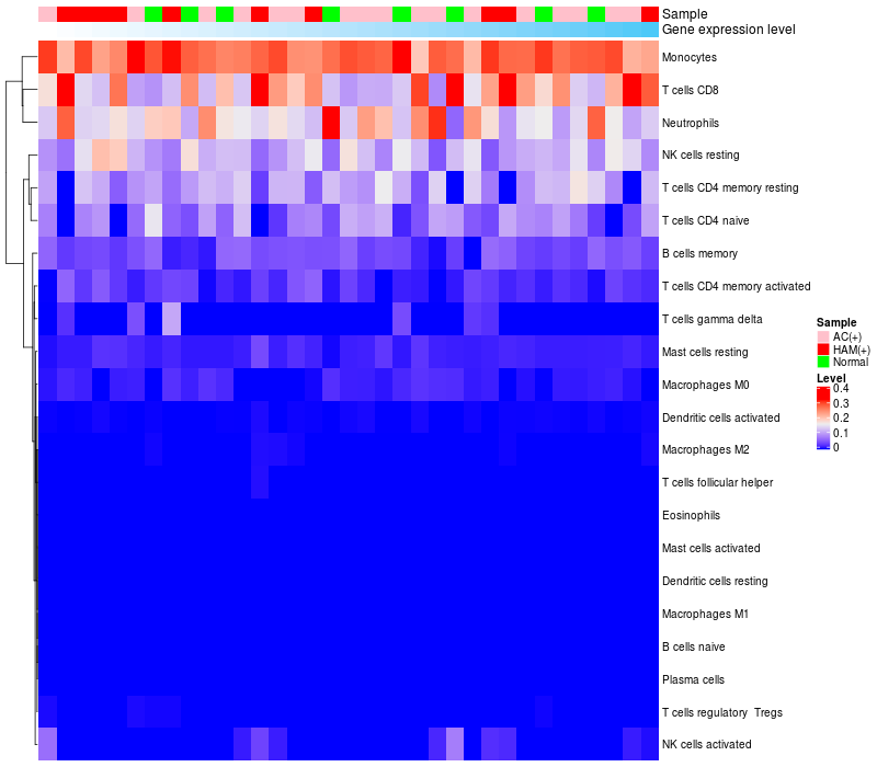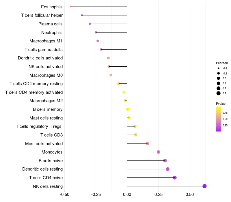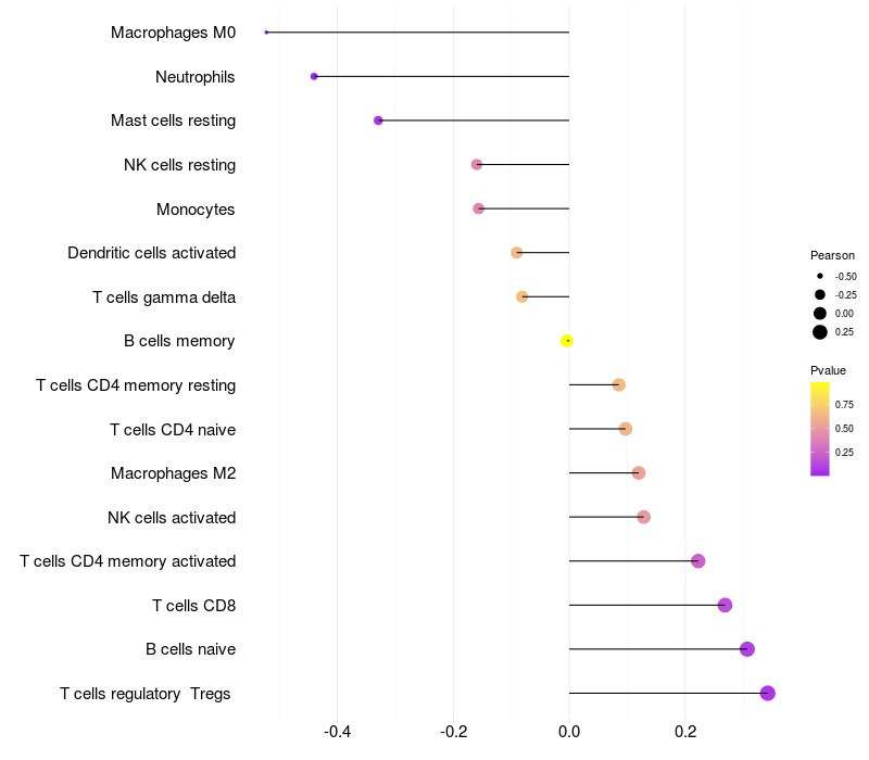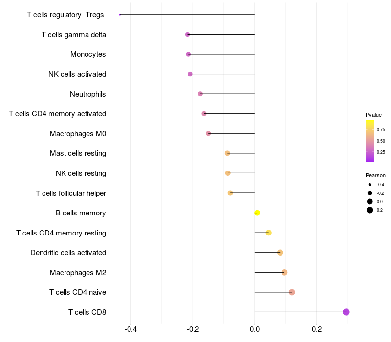 Lollipop of PUS7L expression and immune infiltrating cell level correlation result in HTLV1+ samples