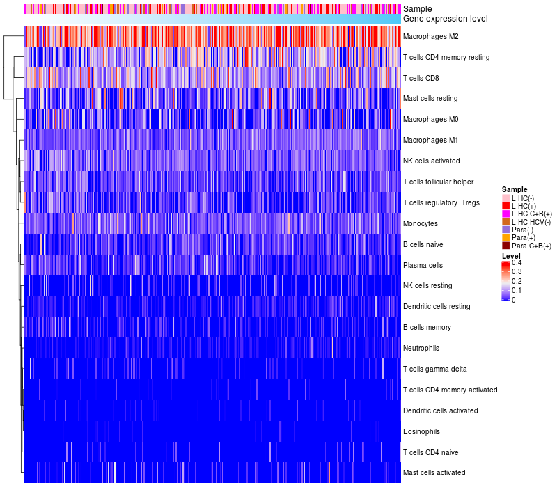 Liver hepatocellular carcinoma HCV (HBV+)(86), Liver hepatocellular carcinoma HCV (HBV-)(19), Liver hepatocellular carcinoma (HBV+)(209), Liver hepatocellular carcinoma (HBV+)(60), Paracancerous HCV (HBV+)(4), Paracancerous (HBV-)(28), Paracancerous (HBV+)(18) |