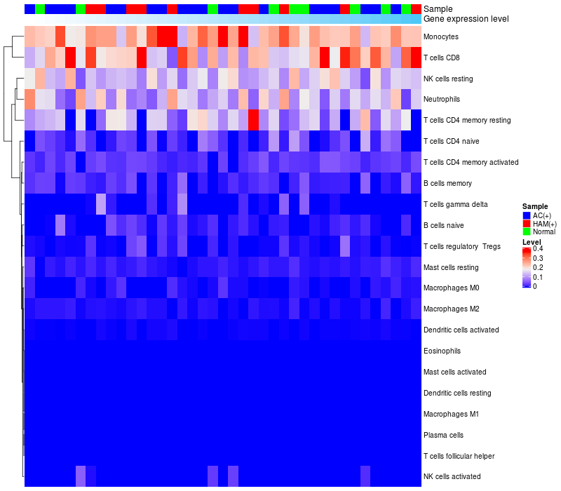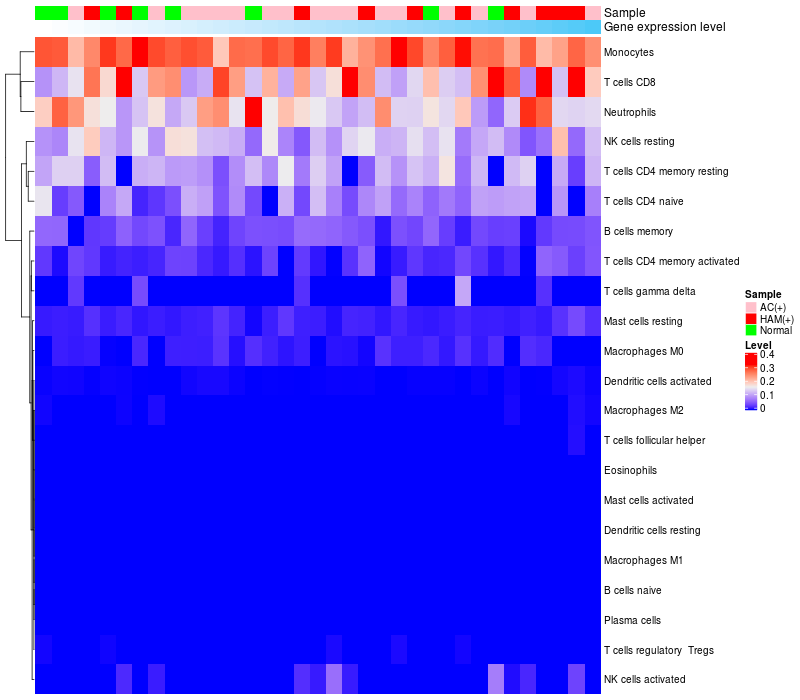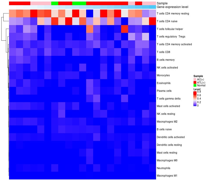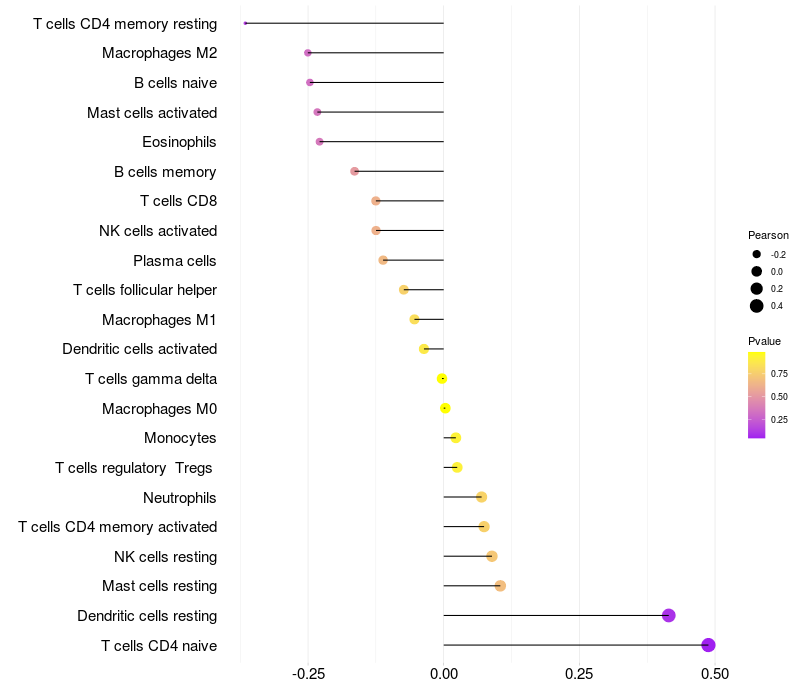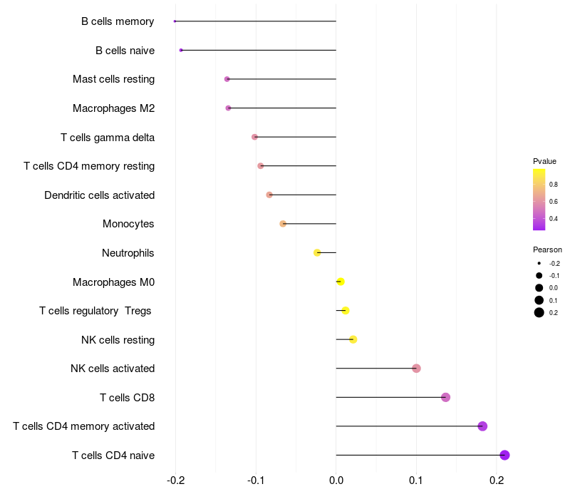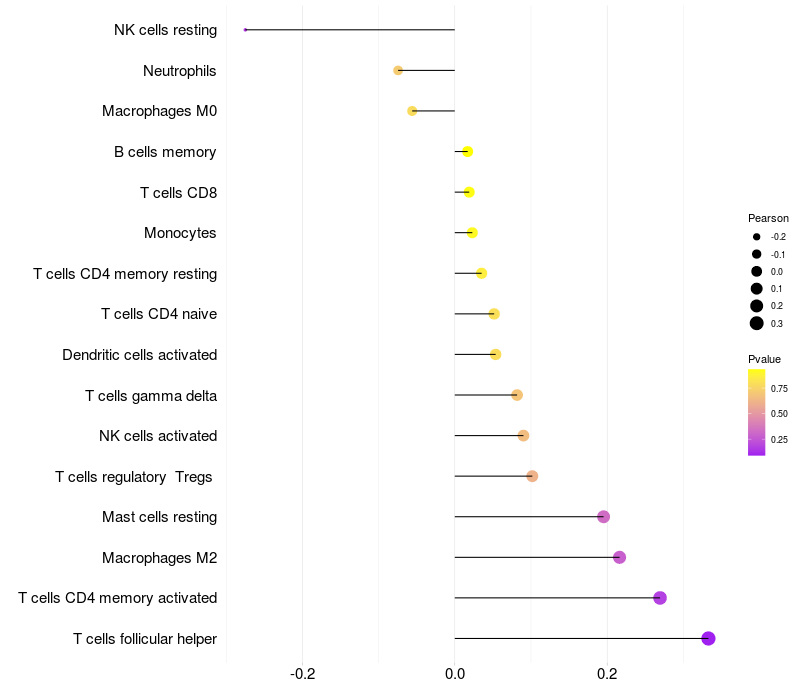 Lollipop of PYGO1 expression and immune infiltrating cell level correlation result in HTLV1+ samples