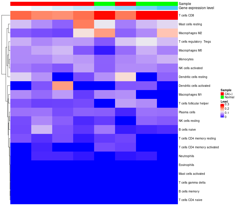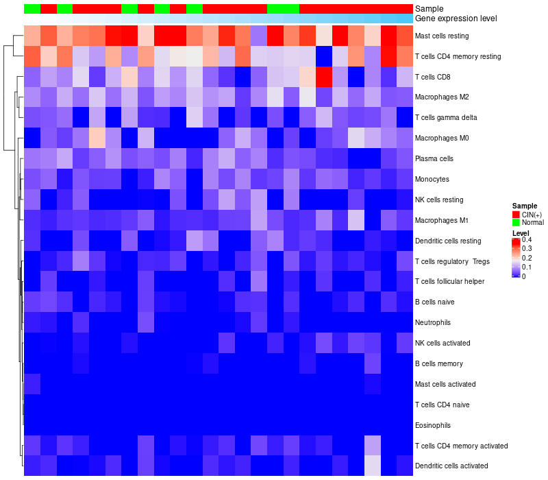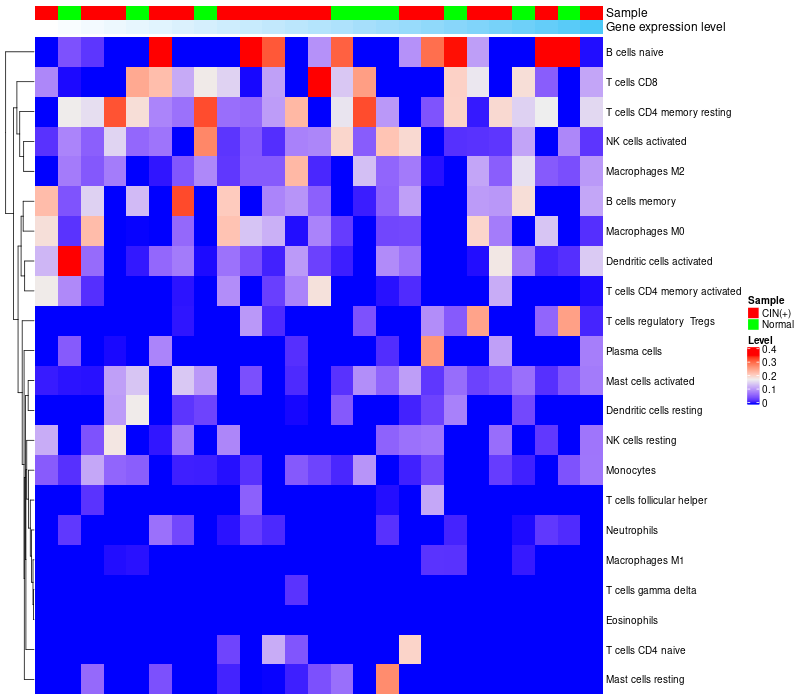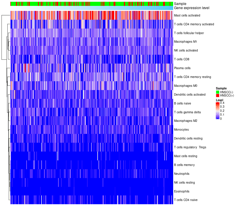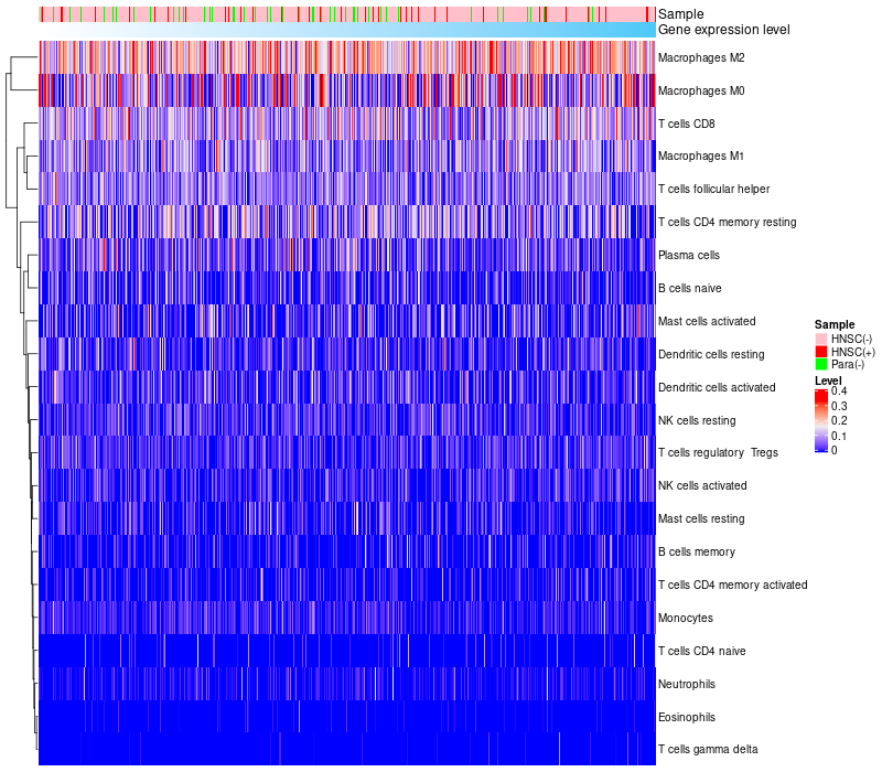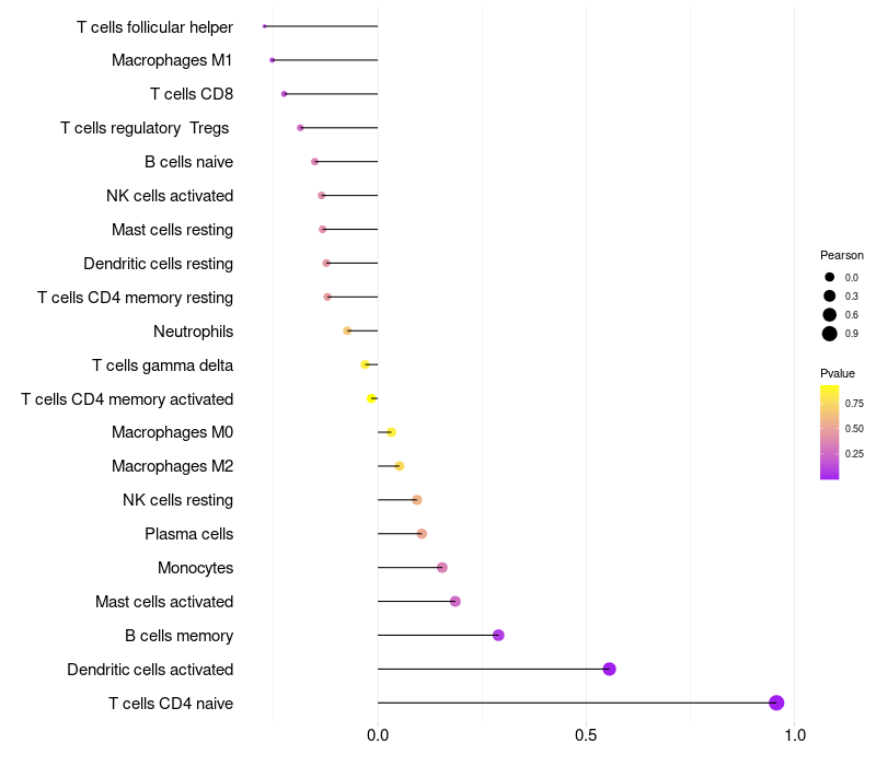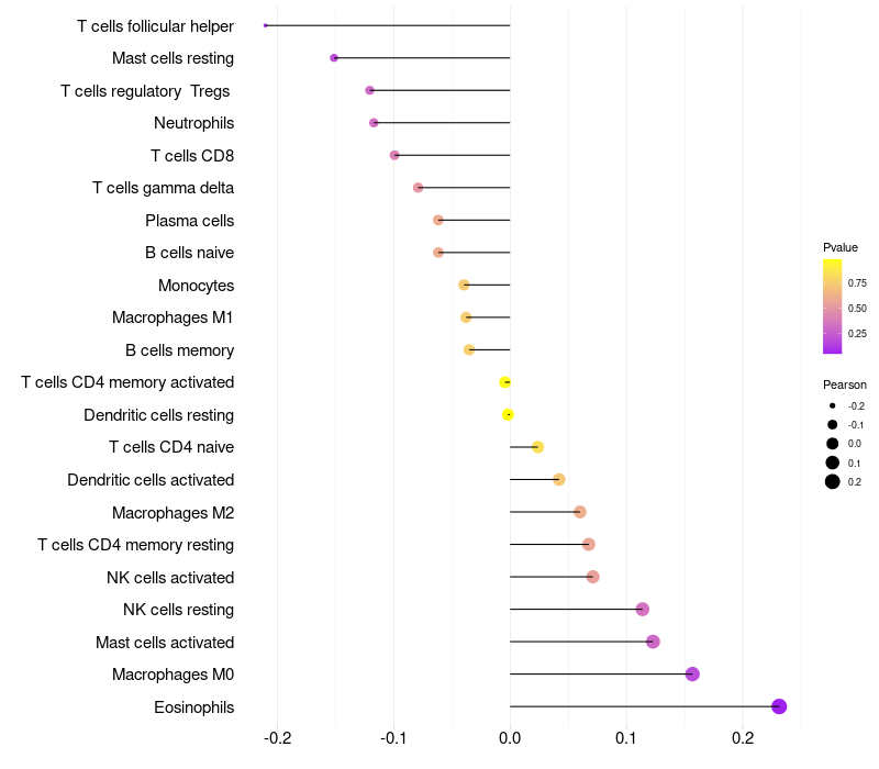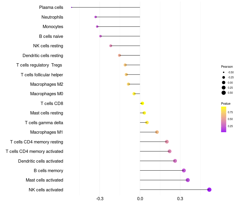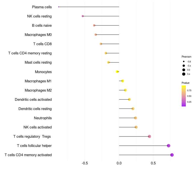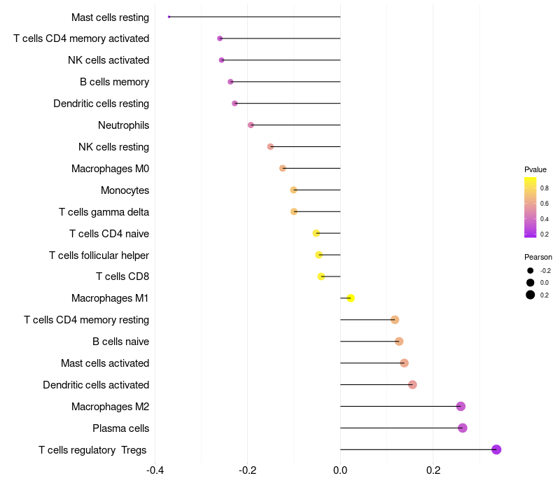 Lollipop of PYY expression and immune infiltrating cell level correlation result in HPV+ samples