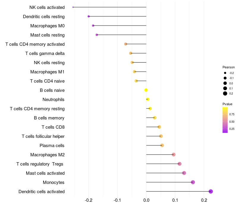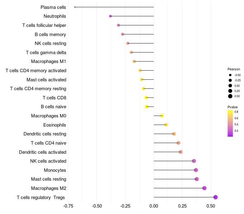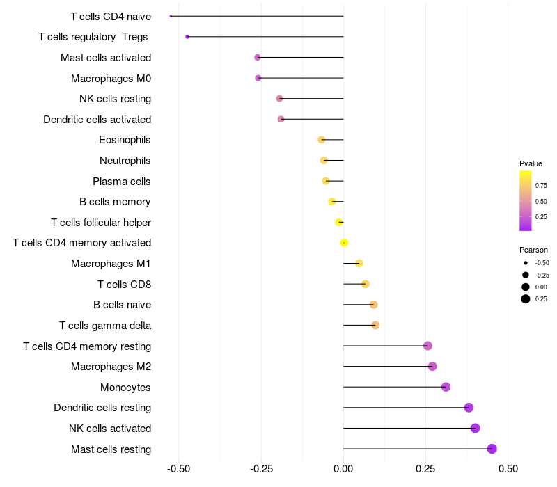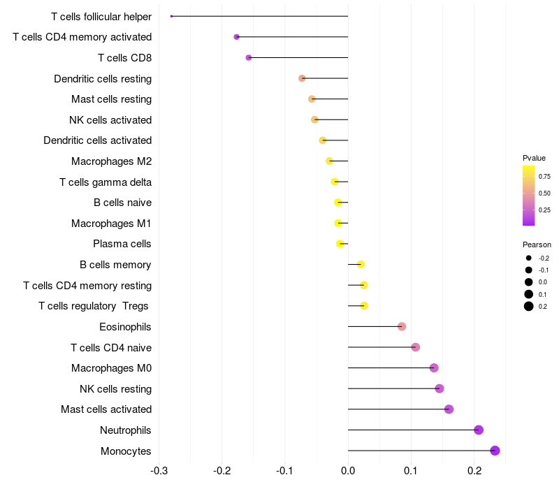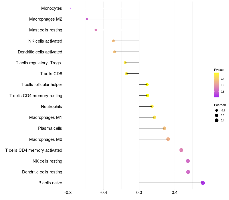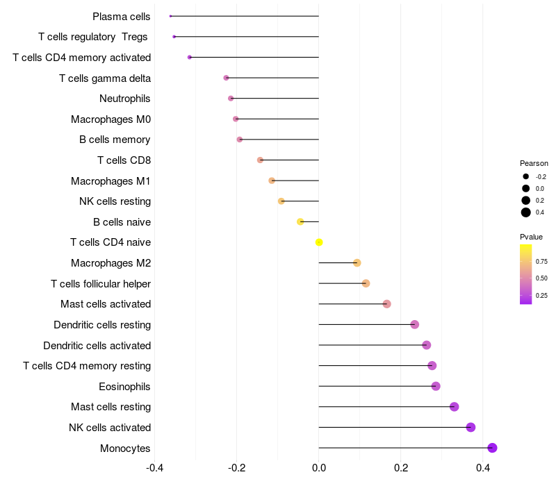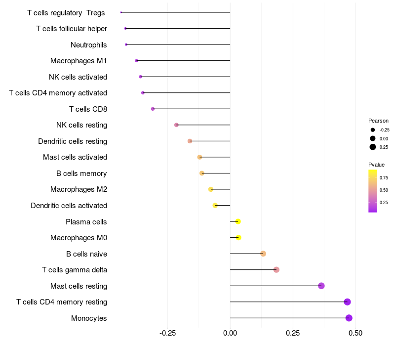 Lollipop of PZP expression and immune infiltrating cell level correlation result in HPV+ samples
