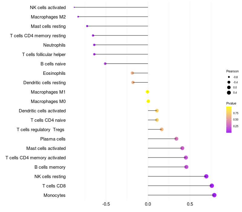 Lollipop of R3HDM2 expression and immune infiltrating cell level correlation result in HBV+ Chronic HBV (CHB) infection samples