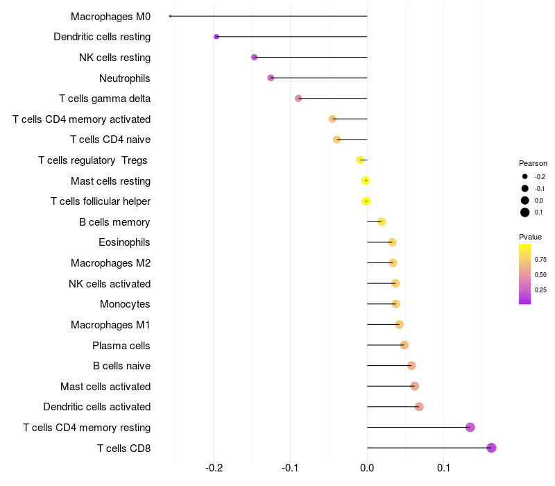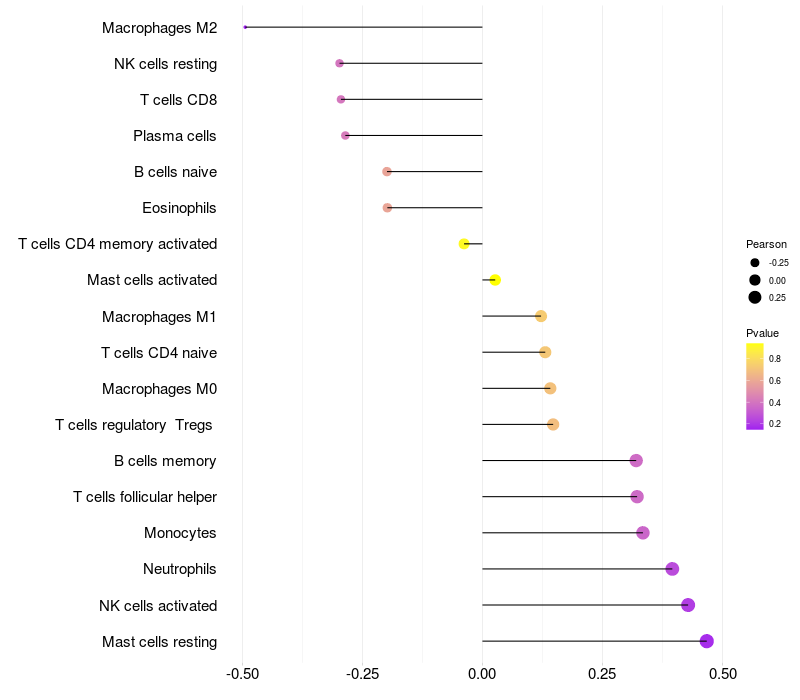 Lollipop of R3HDM2 expression and immune infiltrating cell level correlation result in HBV+ Liver cirrhosis samples
