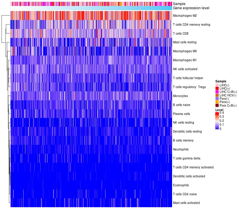 Liver hepatocellular carcinoma HCV (HBV+)(86), Liver hepatocellular carcinoma HCV (HBV-)(19), Liver hepatocellular carcinoma (HBV+)(209), Liver hepatocellular carcinoma (HBV+)(60), Paracancerous HCV (HBV+)(4), Paracancerous (HBV-)(28), Paracancerous (HBV+)(18) |