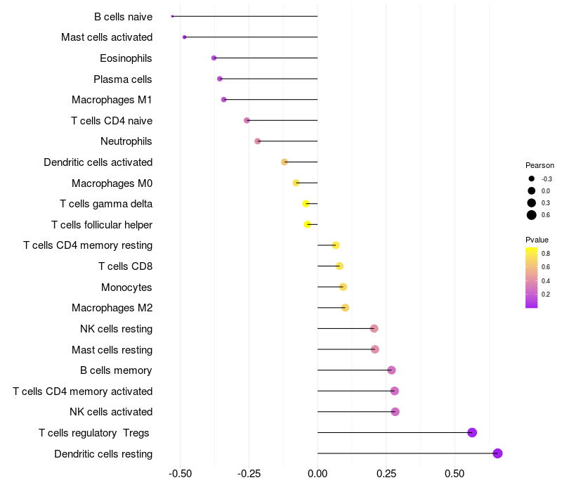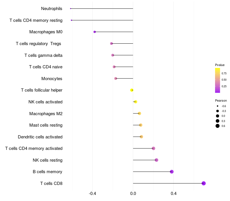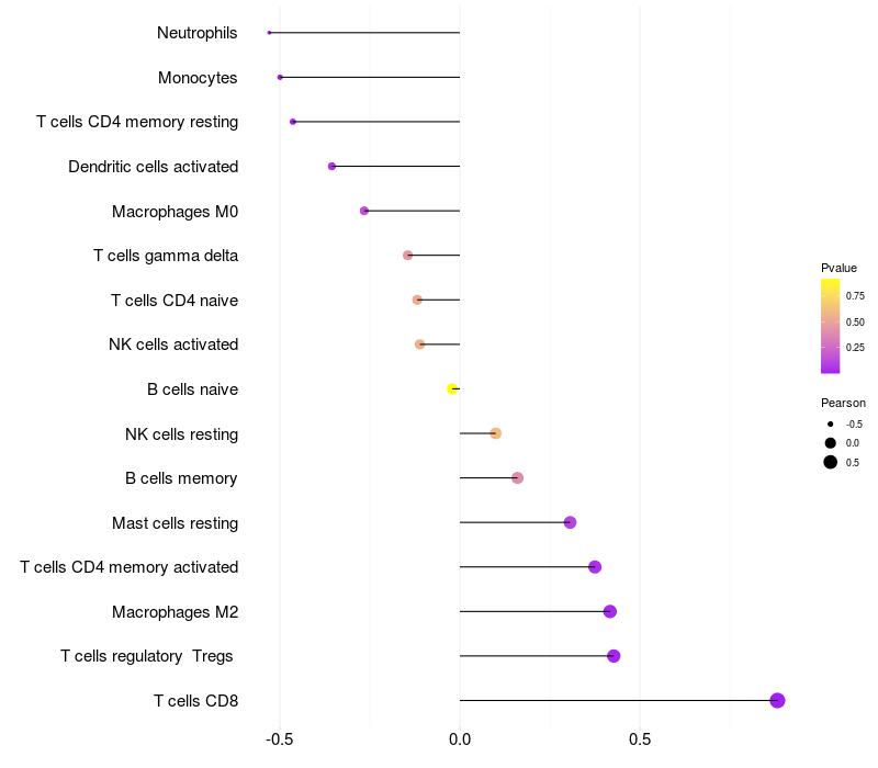 Lollipop of RAB11FIP5 expression and immune infiltrating cell level correlation result in HTLV1+ samples