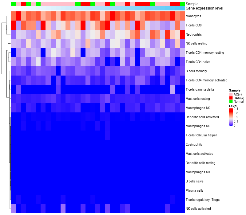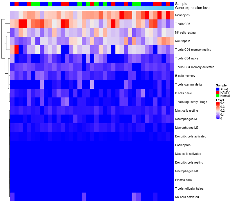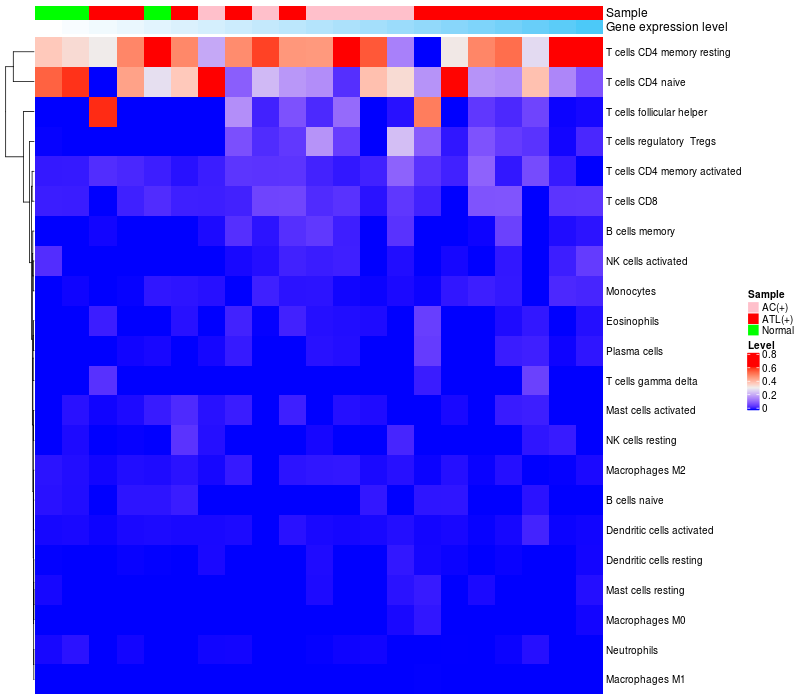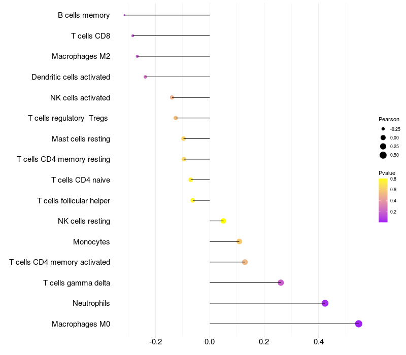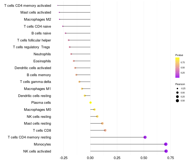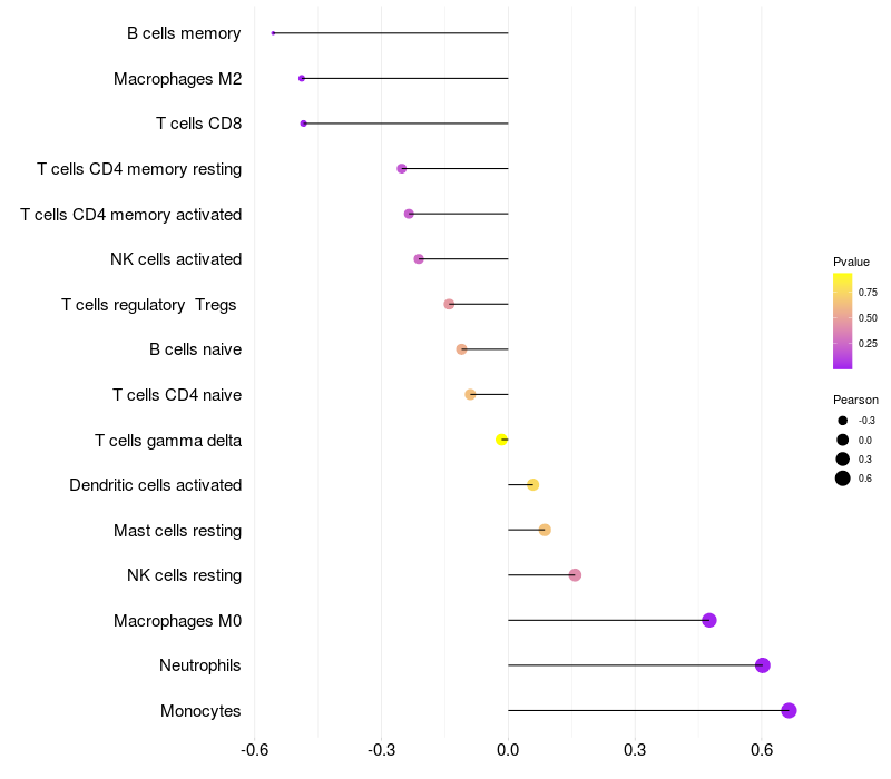 Lollipop of RAB31 expression and immune infiltrating cell level correlation result in HTLV1+ samples