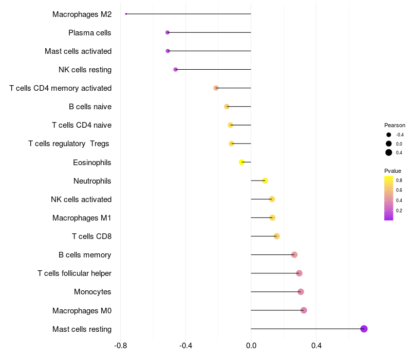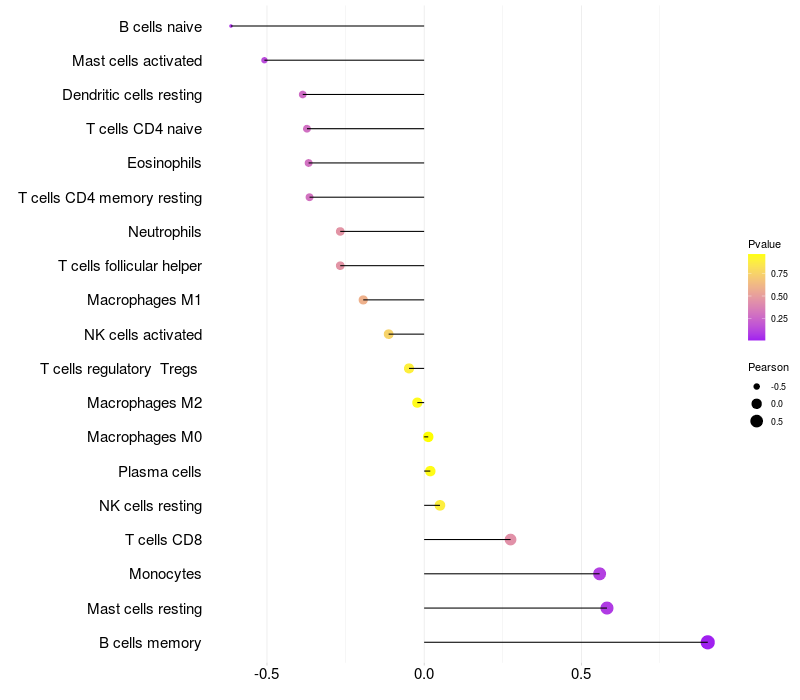 Lollipop of RABGAP1L expression and immune infiltrating cell level correlation result in HBV+ Liver cirrhosis samples