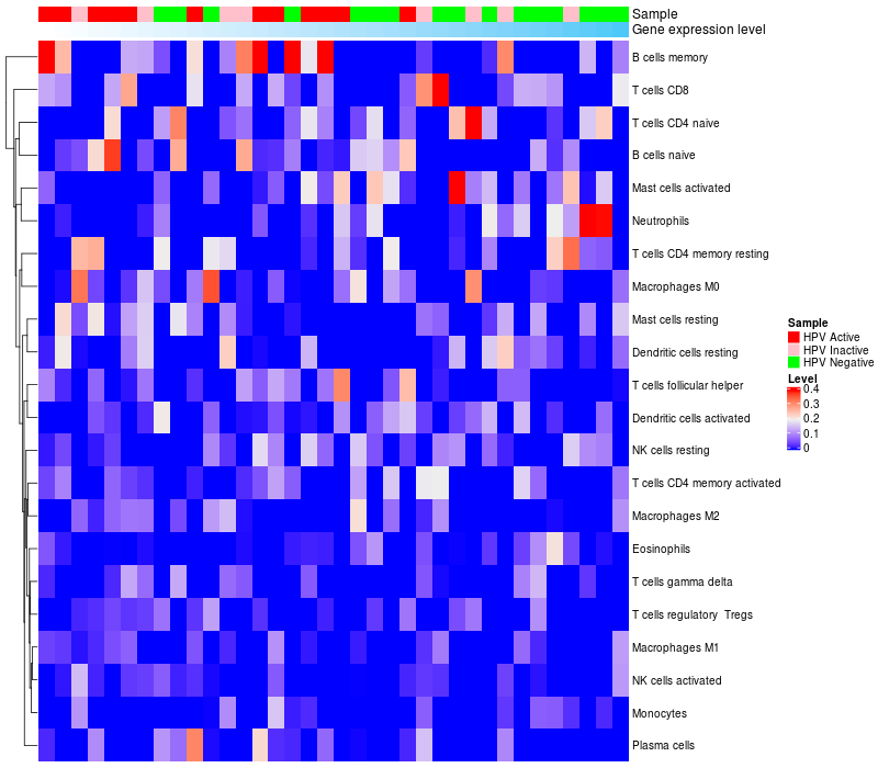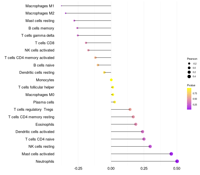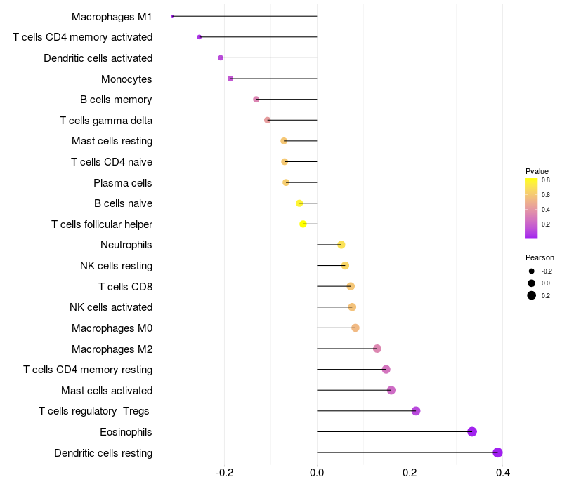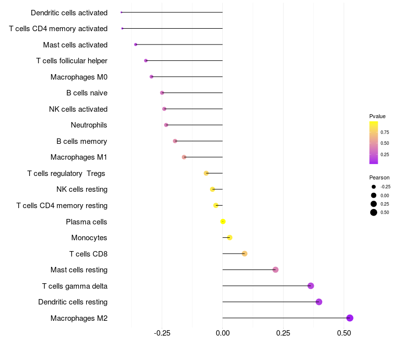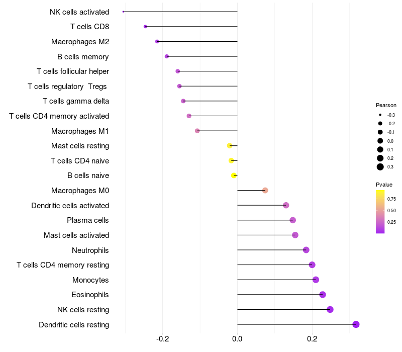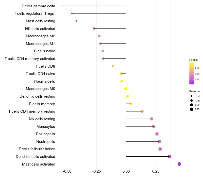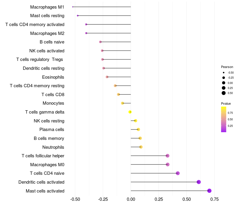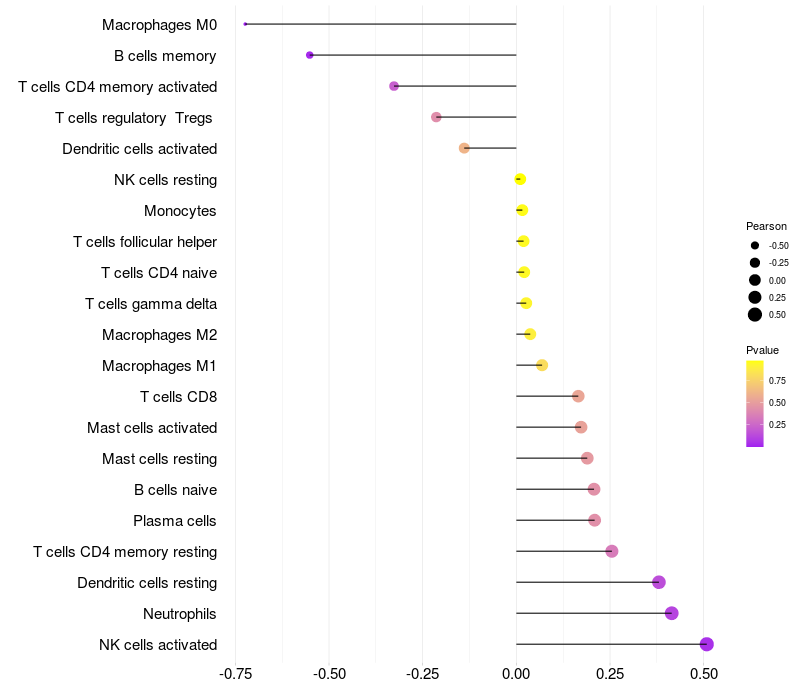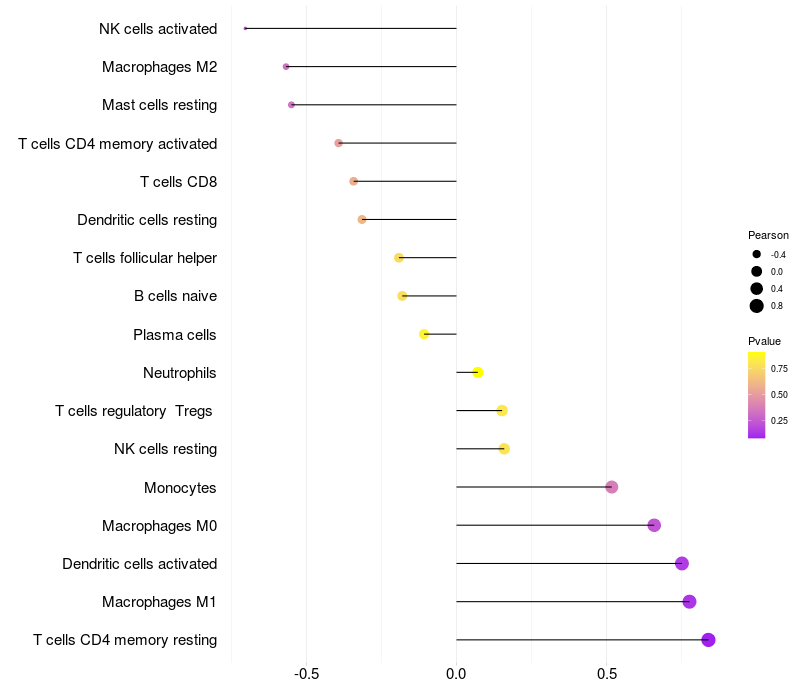 Lollipop of RABGEF1 expression and immune infiltrating cell level correlation result in HPV+ samples