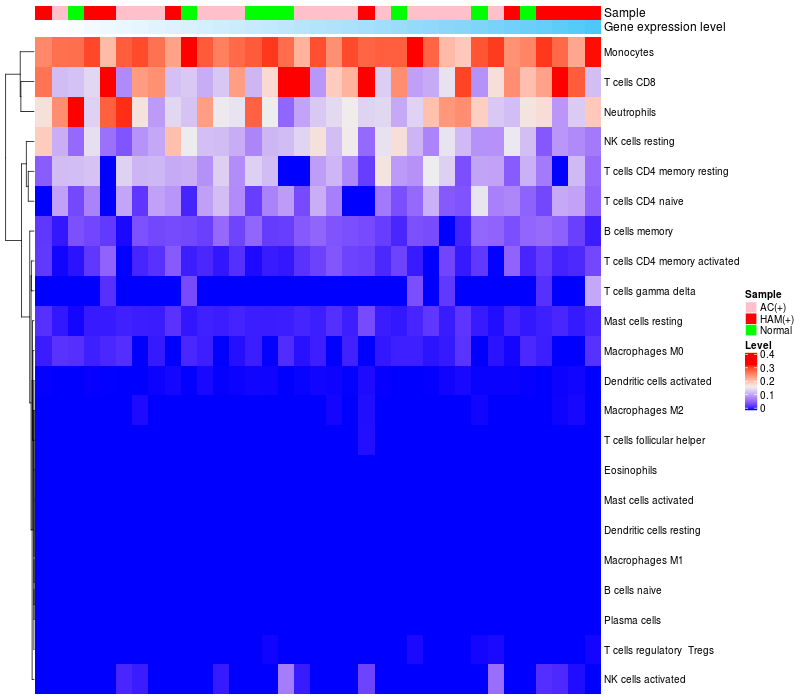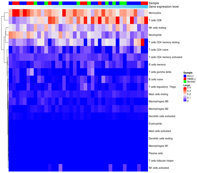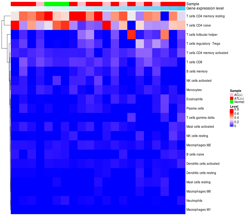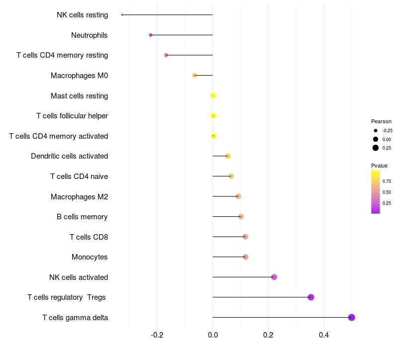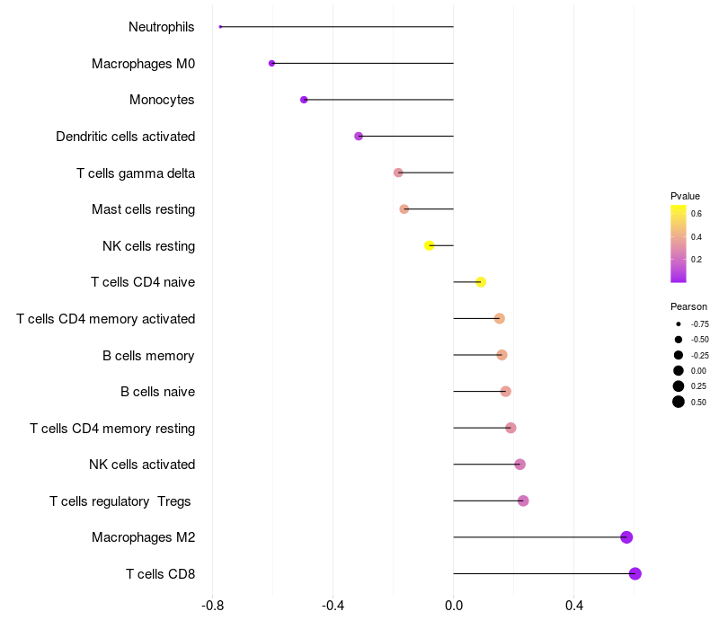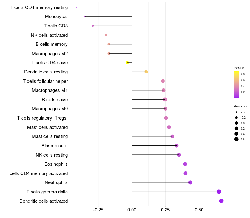 Lollipop of RABGGTB expression and immune infiltrating cell level correlation result in HTLV1+ samples