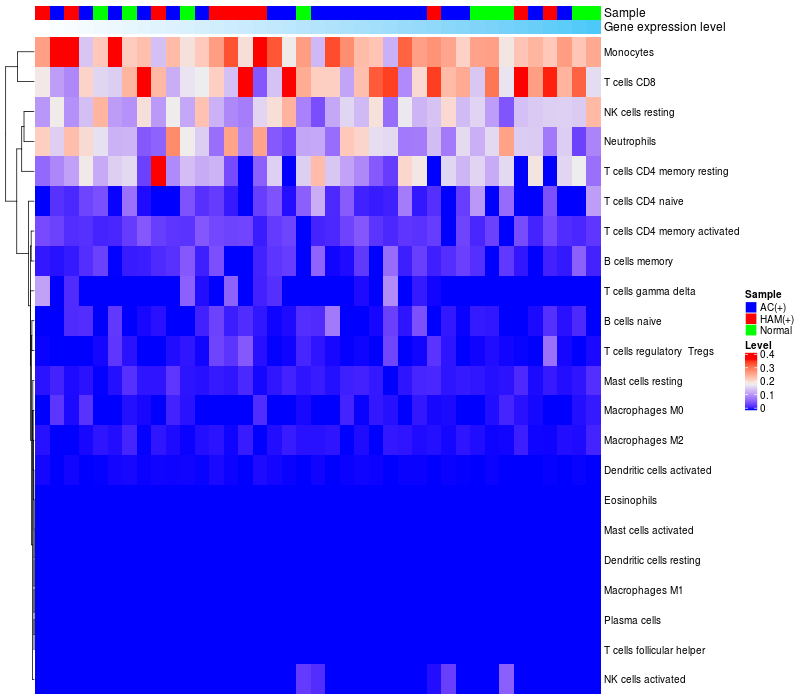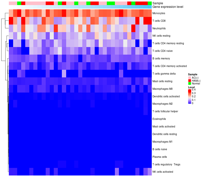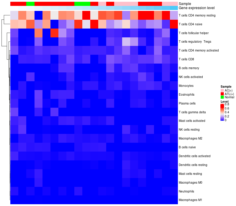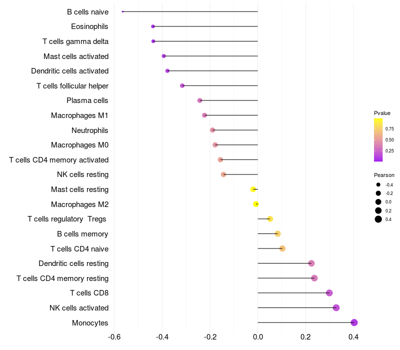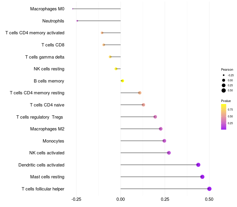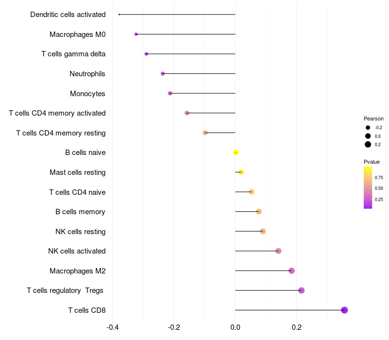 Lollipop of RABIF expression and immune infiltrating cell level correlation result in HTLV1+ samples