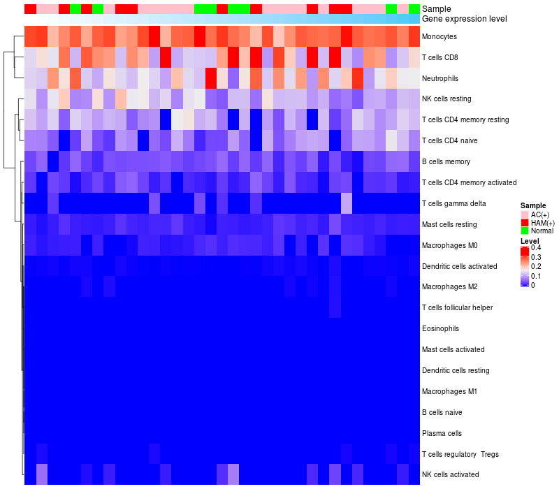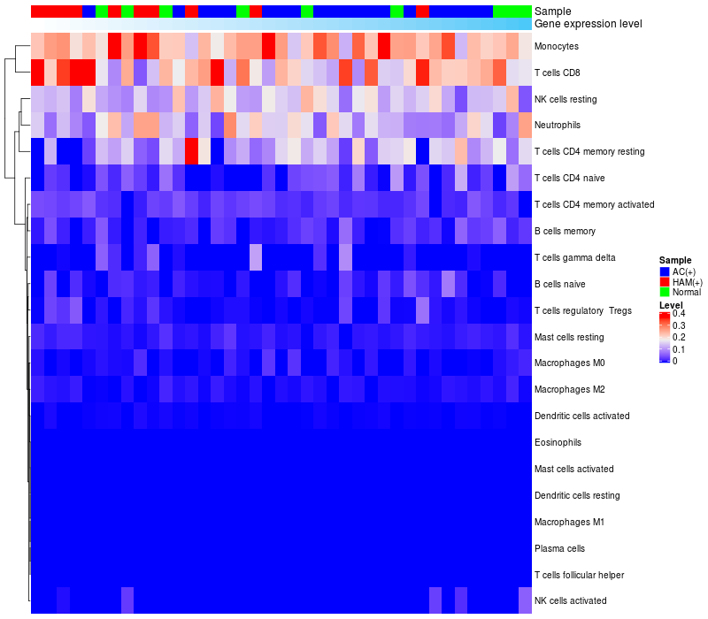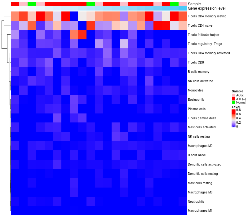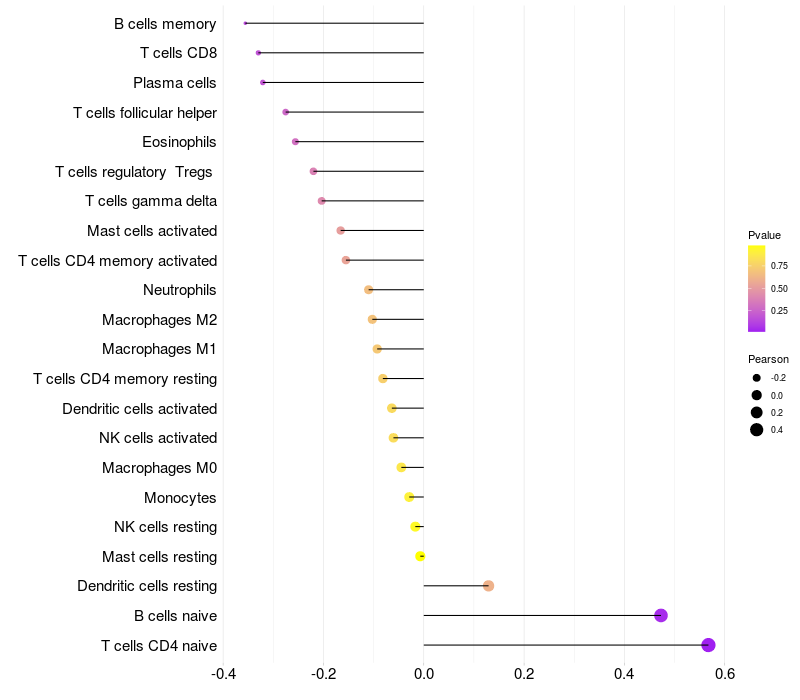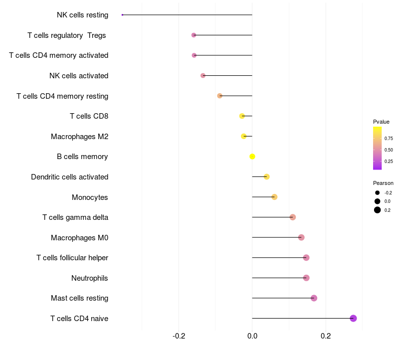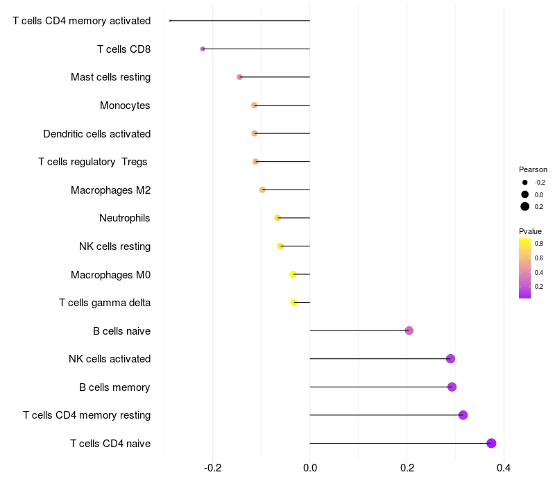 Lollipop of RAI14 expression and immune infiltrating cell level correlation result in HTLV1+ samples
