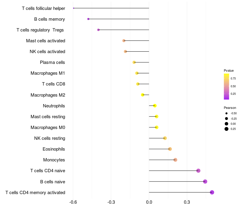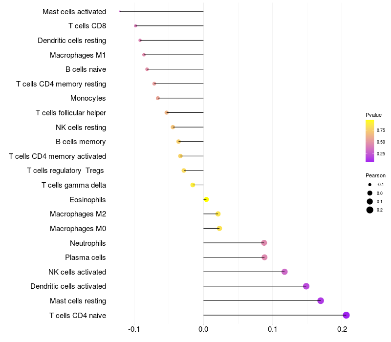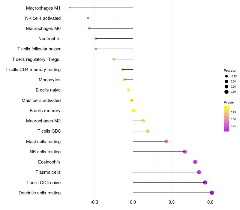 Lollipop of RALGPS1 expression and immune infiltrating cell level correlation result in HBV+ Liver cirrhosis samples