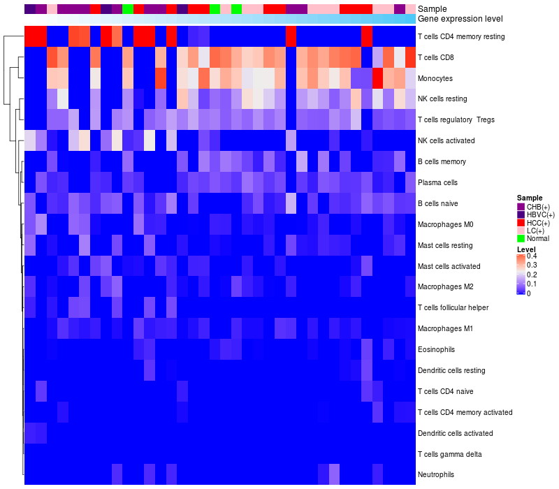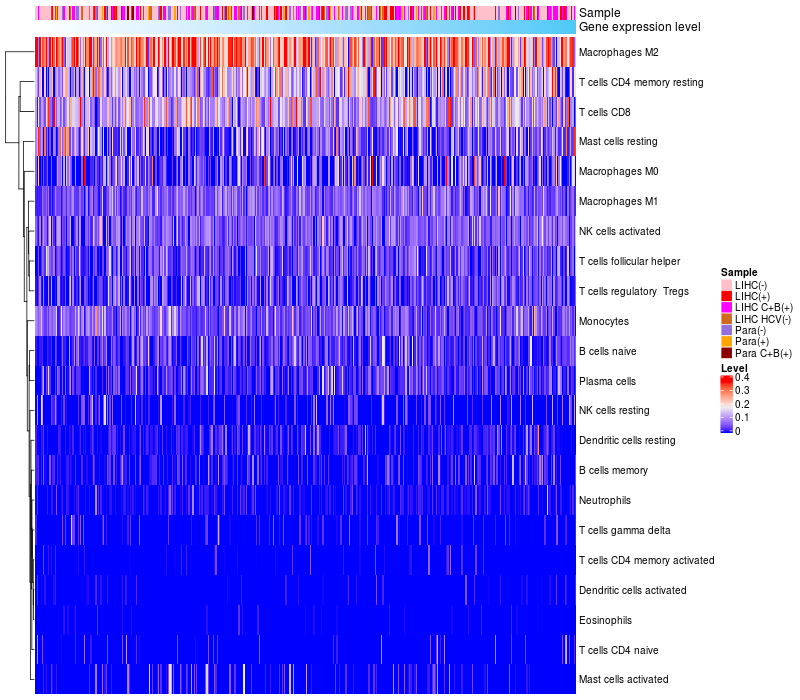Liver hepatocellular carcinoma HCV (HBV+)(86), Liver hepatocellular carcinoma HCV (HBV-)(19), Liver hepatocellular carcinoma (HBV+)(209), Liver hepatocellular carcinoma (HBV+)(60), Paracancerous HCV (HBV+)(4), Paracancerous (HBV-)(28), Paracancerous (HBV+)(18) |