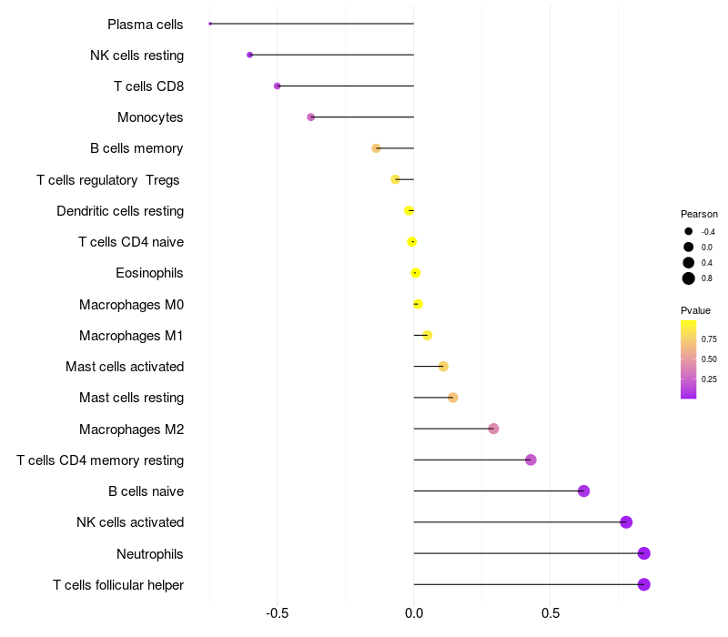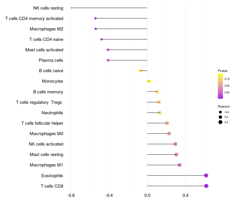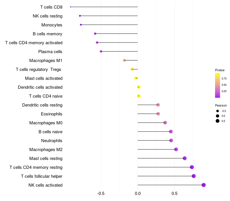 Lollipop of RANBP10 expression and immune infiltrating cell level correlation result in HBV+ Liver cirrhosis samples