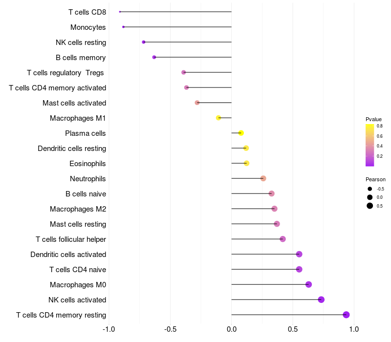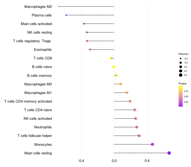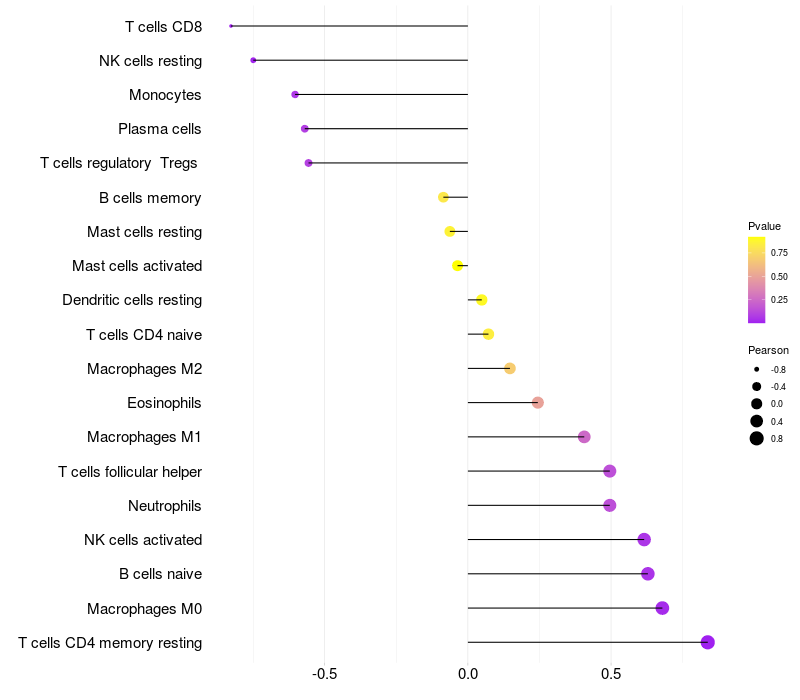 Lollipop of RANBP3 expression and immune infiltrating cell level correlation result in HBV+ Liver cirrhosis samples