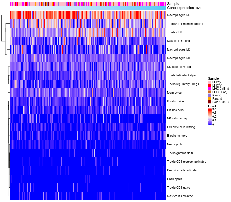 Liver hepatocellular carcinoma HCV (HBV+)(86), Liver hepatocellular carcinoma HCV (HBV-)(19), Liver hepatocellular carcinoma (HBV+)(209), Liver hepatocellular carcinoma (HBV+)(60), Paracancerous HCV (HBV+)(4), Paracancerous (HBV-)(28), Paracancerous (HBV+)(18) |