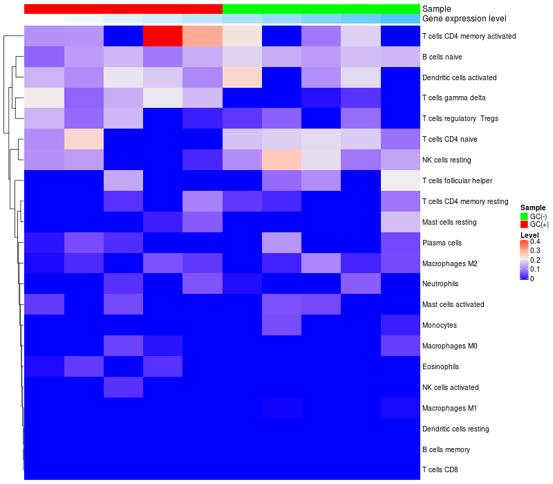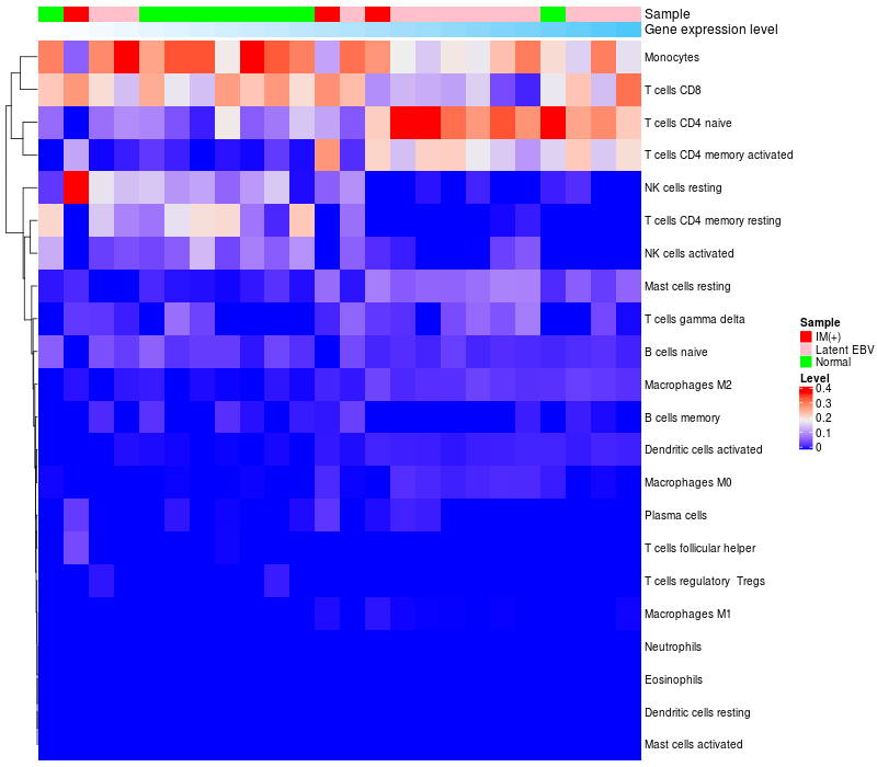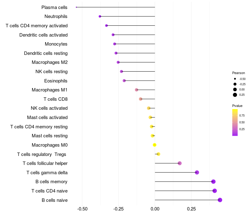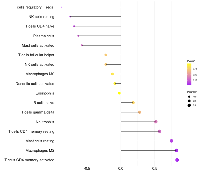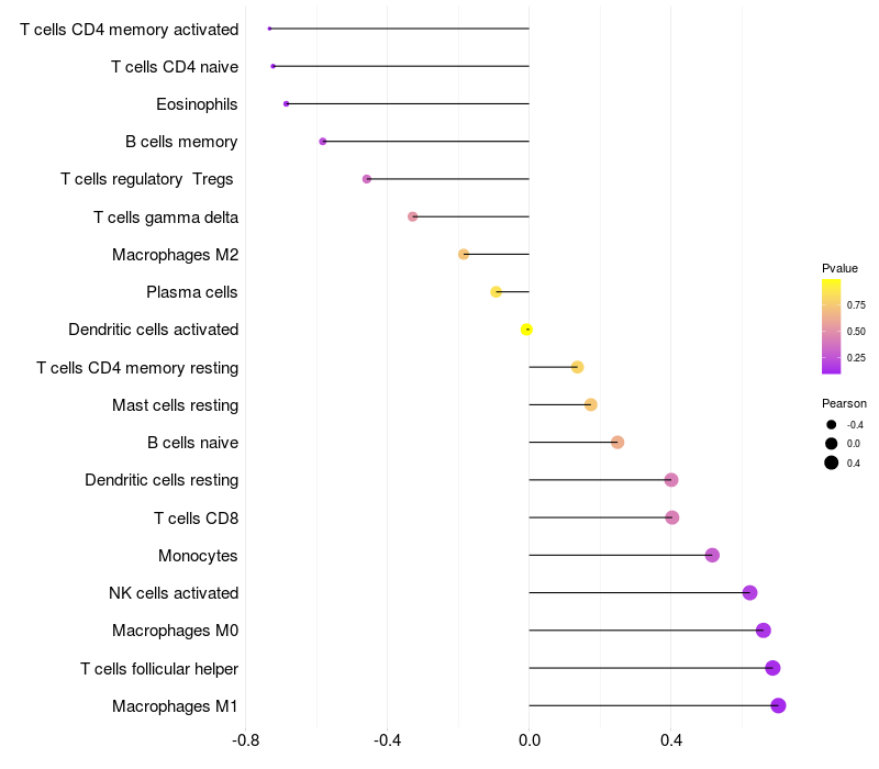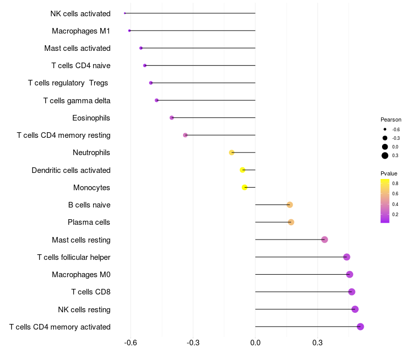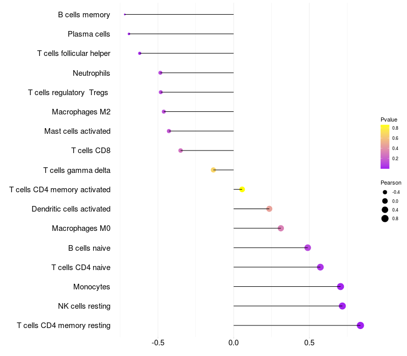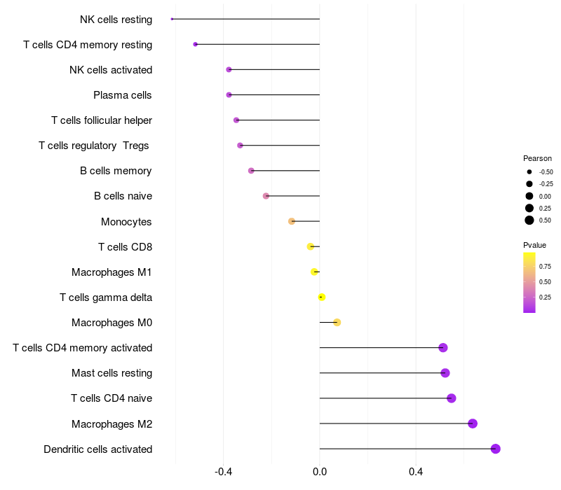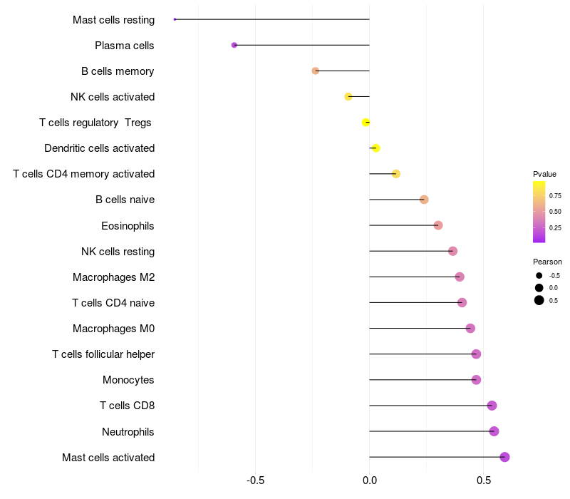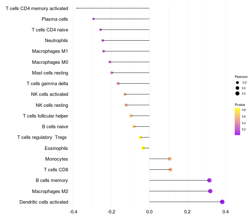 Lollipop of RAPGEF1 expression and immune infiltrating cell level correlation result in EBV+ samples