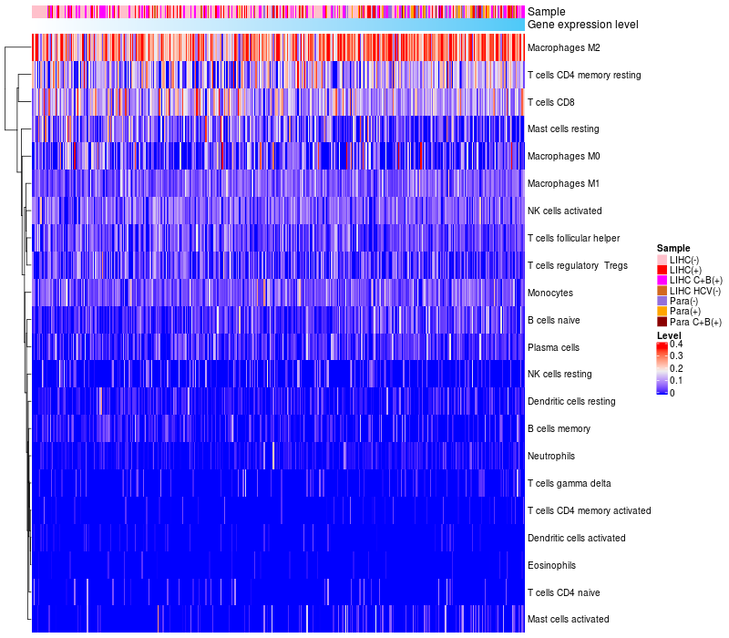 Liver hepatocellular carcinoma HCV (HBV+)(86), Liver hepatocellular carcinoma HCV (HBV-)(19), Liver hepatocellular carcinoma (HBV+)(209), Liver hepatocellular carcinoma (HBV+)(60), Paracancerous HCV (HBV+)(4), Paracancerous (HBV-)(28), Paracancerous (HBV+)(18) |