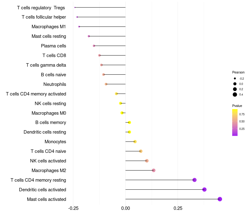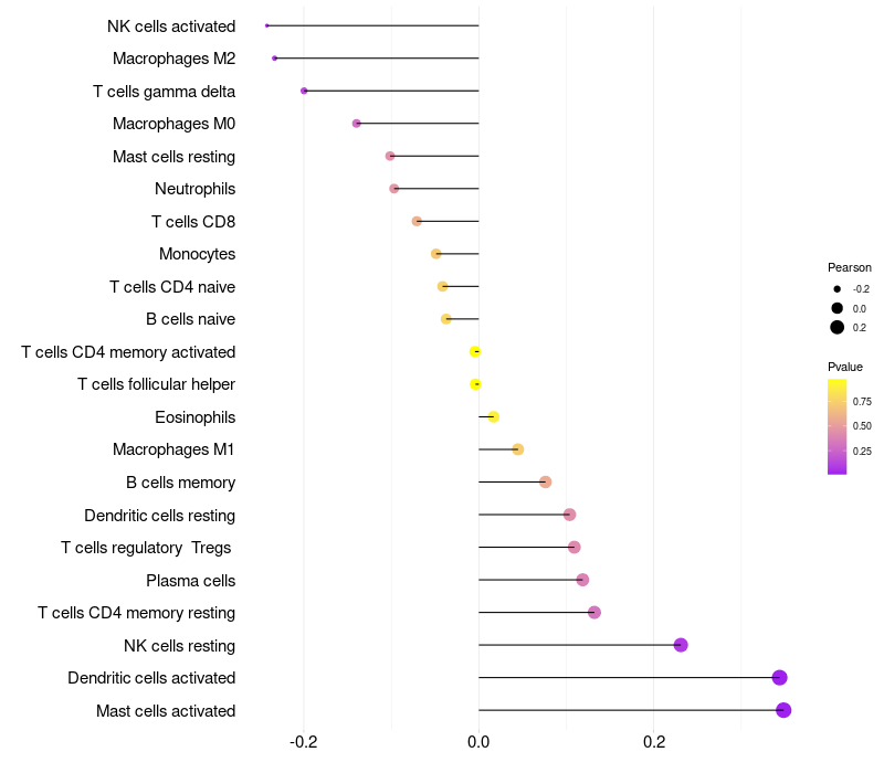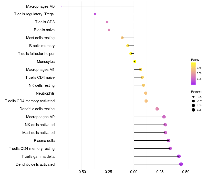 Lollipop of RARS2 expression and immune infiltrating cell level correlation result in HPV+ samples