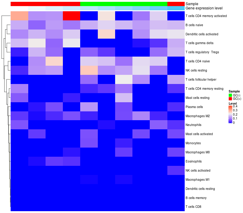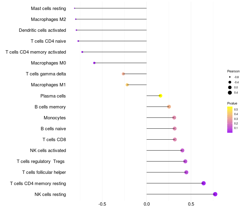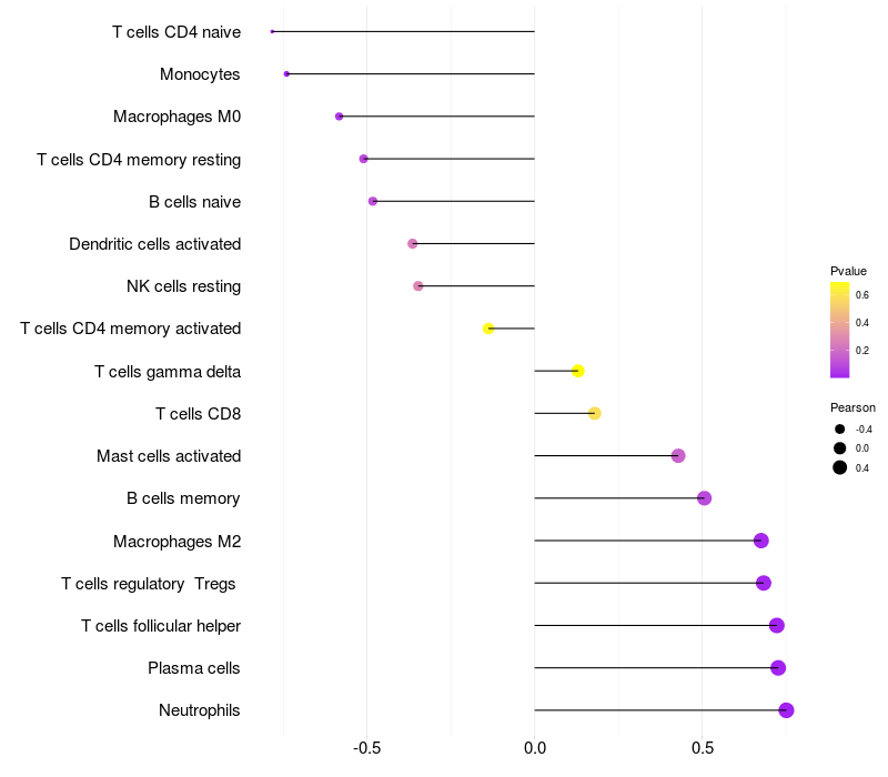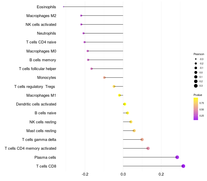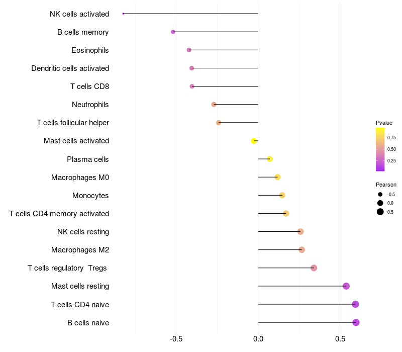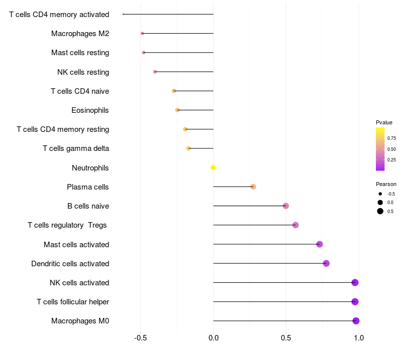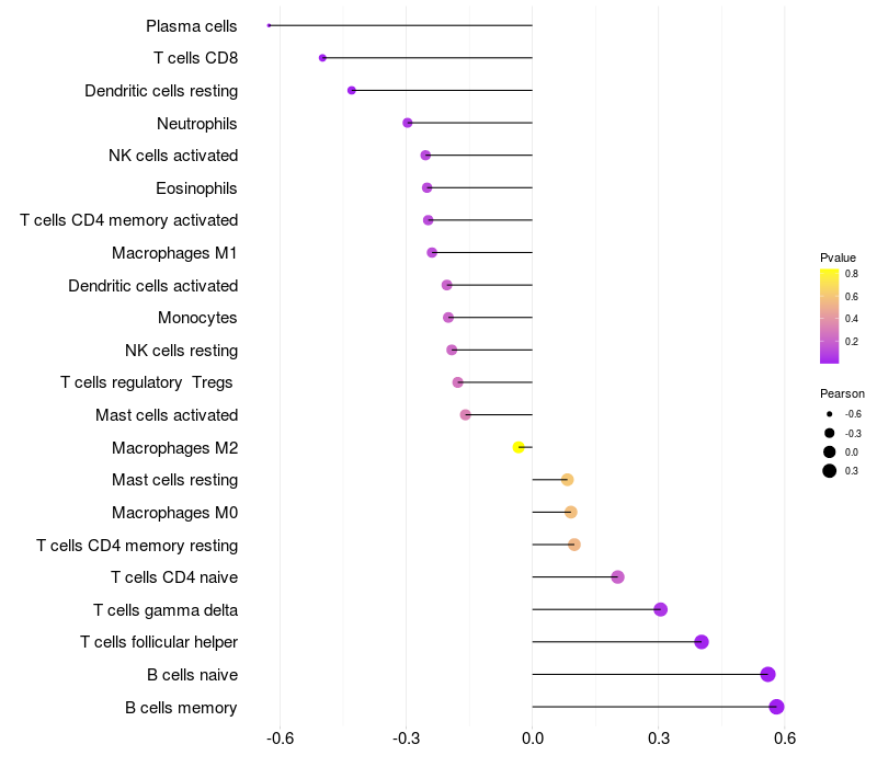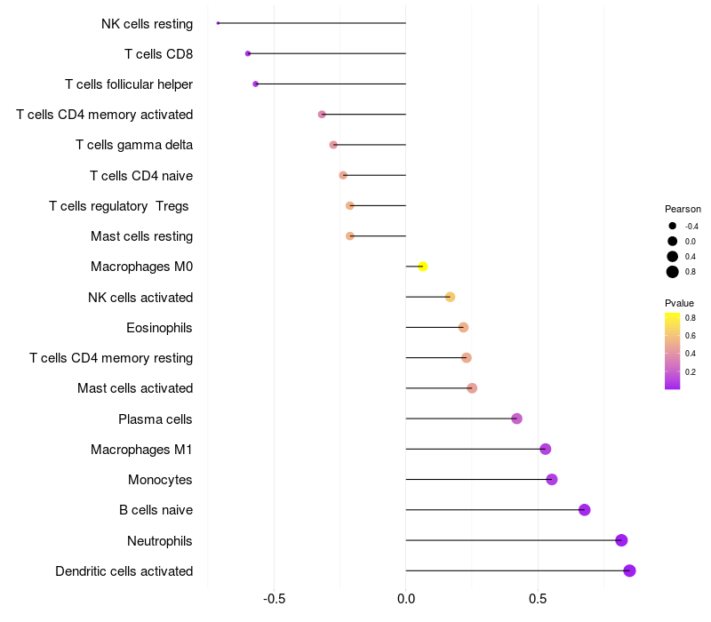 Lollipop of RASGRP3 expression and immune infiltrating cell level correlation result in EBV+ samples