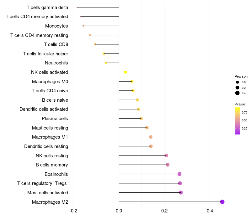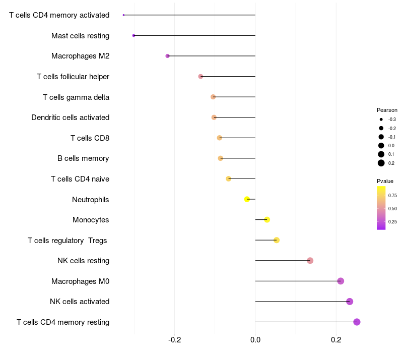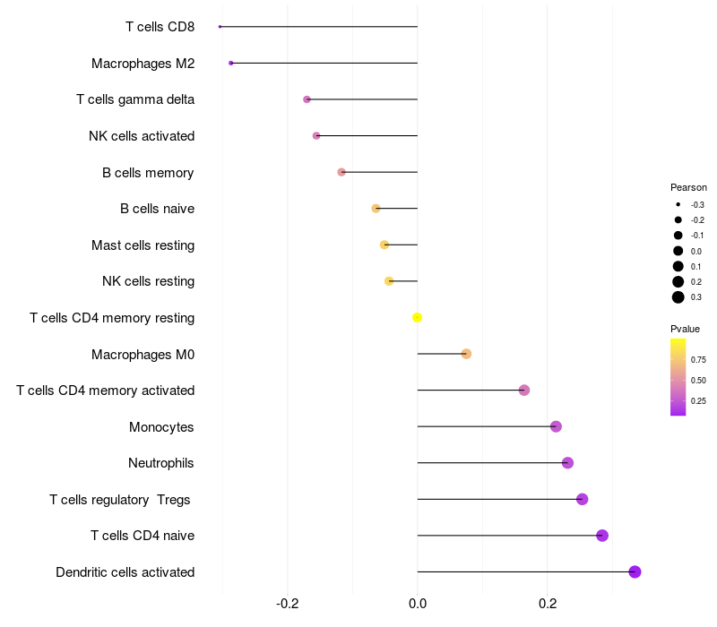 Lollipop of RASL11B expression and immune infiltrating cell level correlation result in HTLV1+ samples
