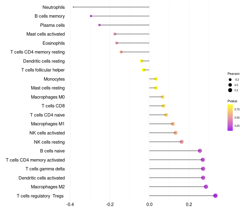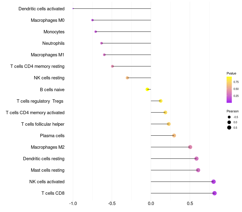 Lollipop of RASSF9 expression and immune infiltrating cell level correlation result in HPV+ samples