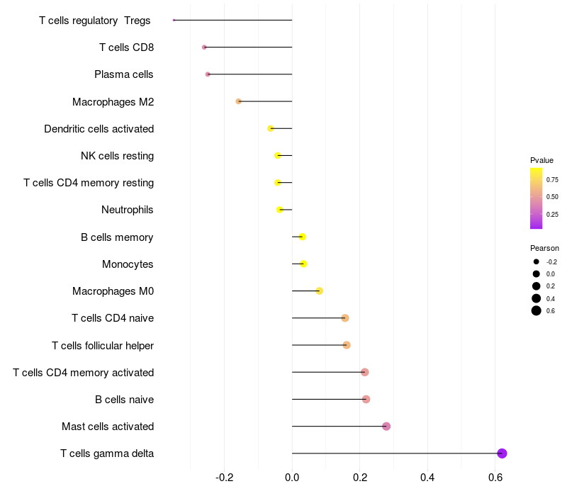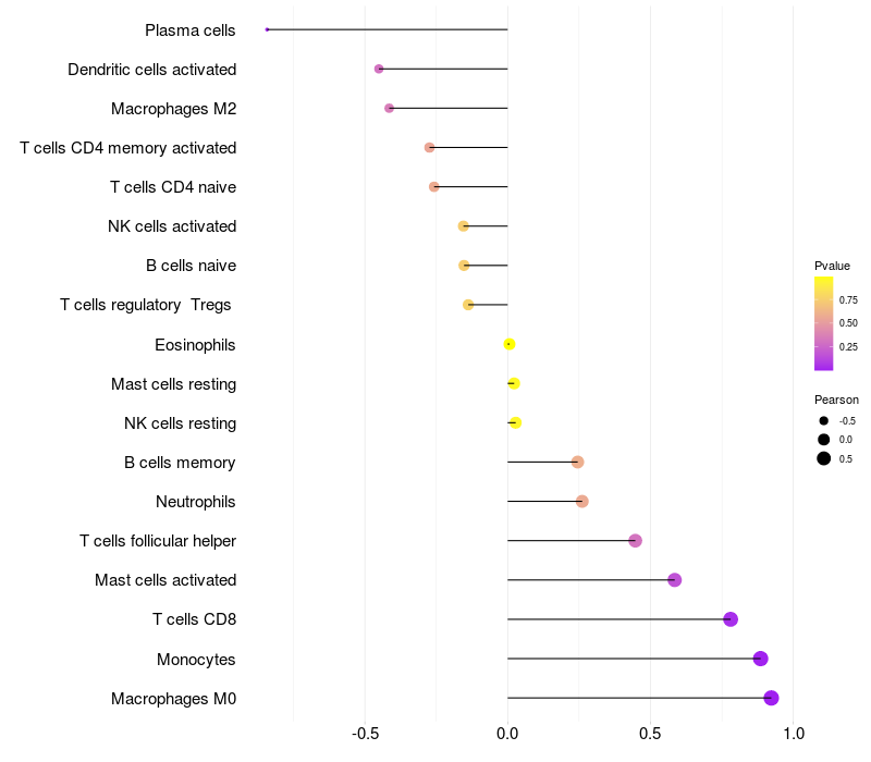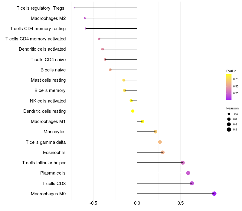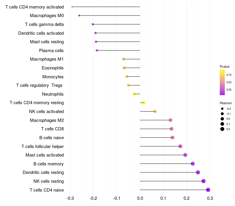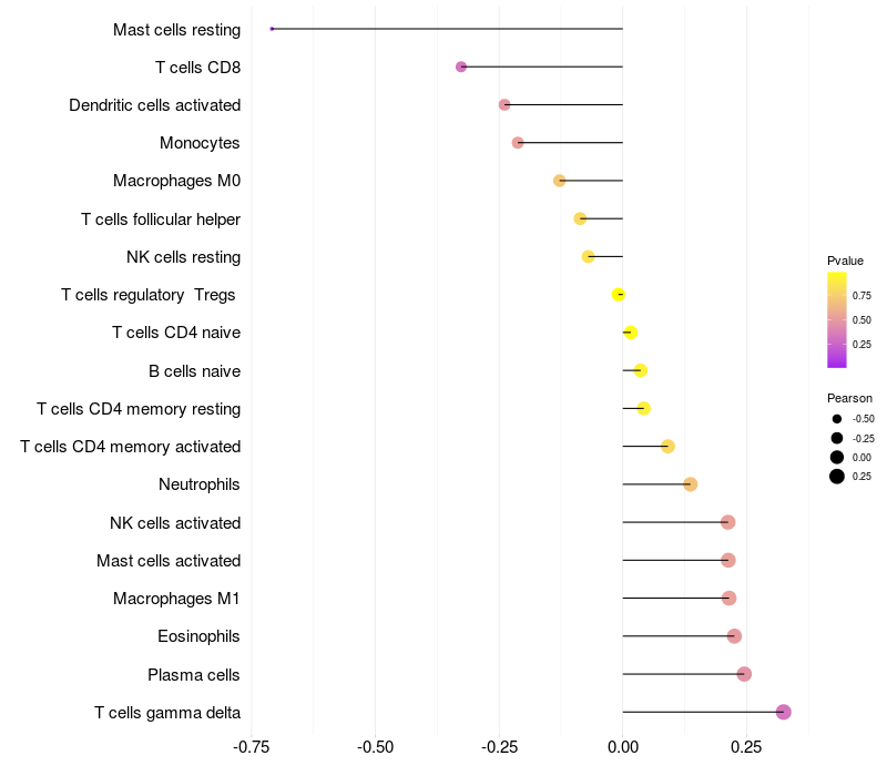Lollipop of RBFOX1 expression and immune infiltrating cell level correlation result in EBV+ samples