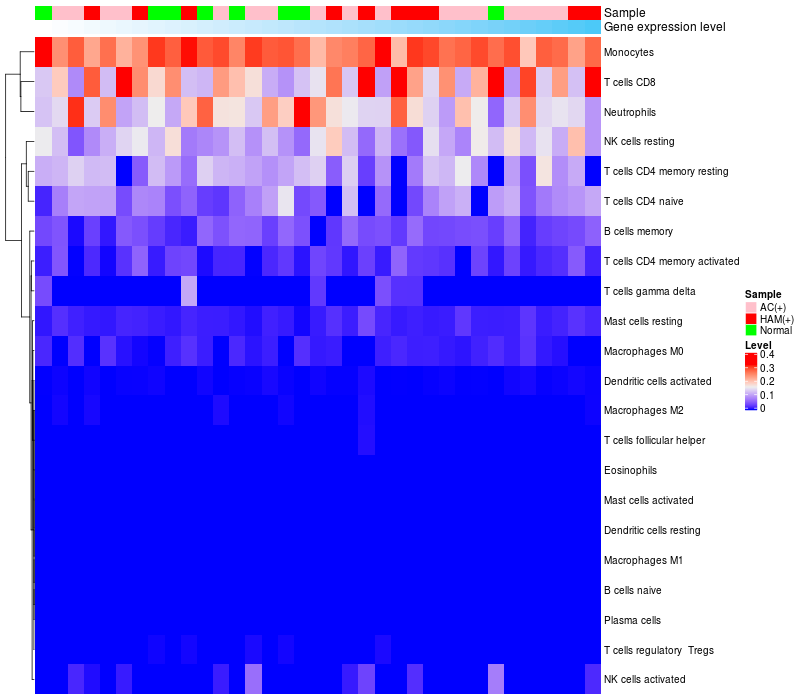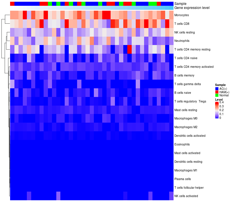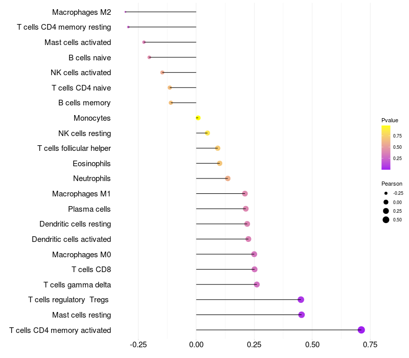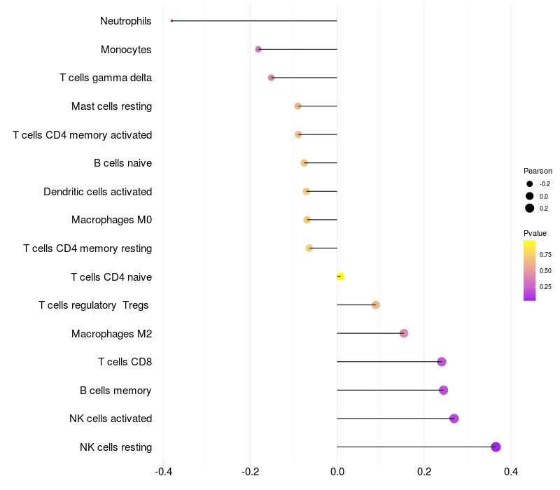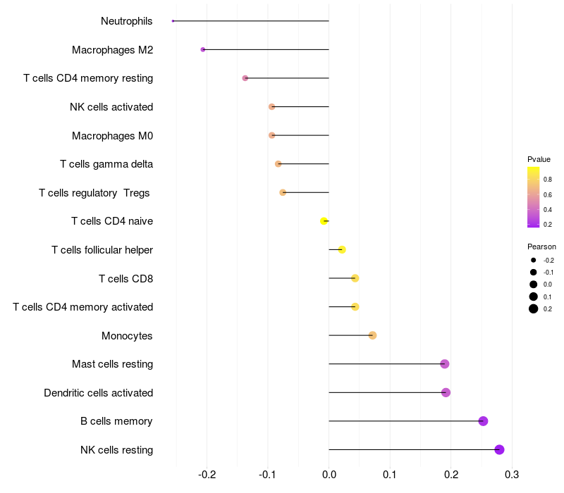 Lollipop of RBM19 expression and immune infiltrating cell level correlation result in HTLV1+ samples